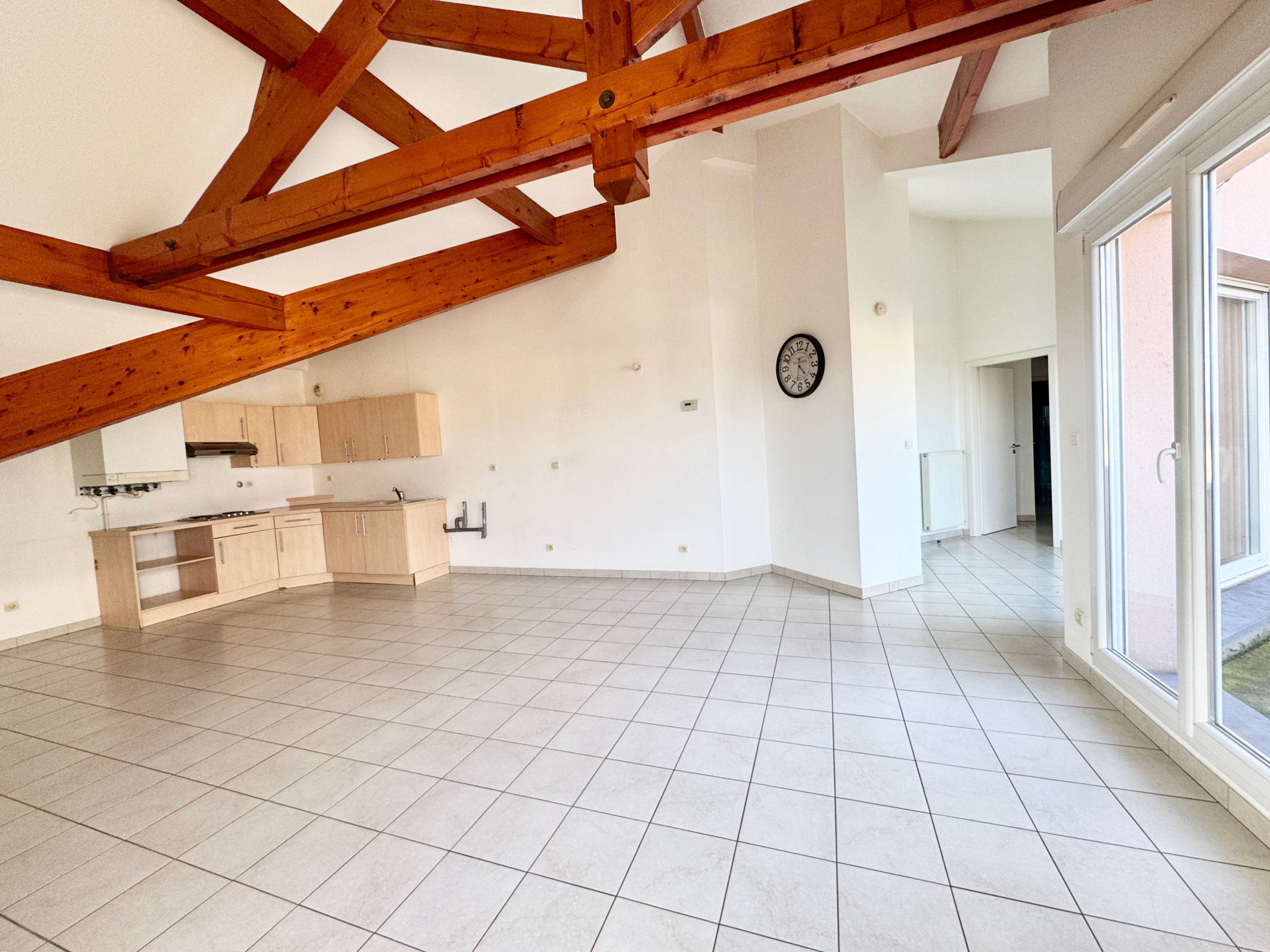 Une cuisine semi-équipée ouverte sur un séjour spacieux et baigné de lumière naturelle grâce à 3 grandes baies vitrées, donnant accès à une vaste terrasse.