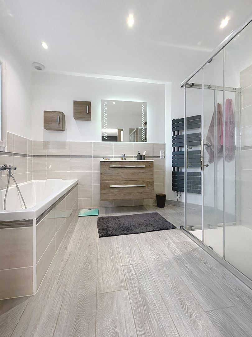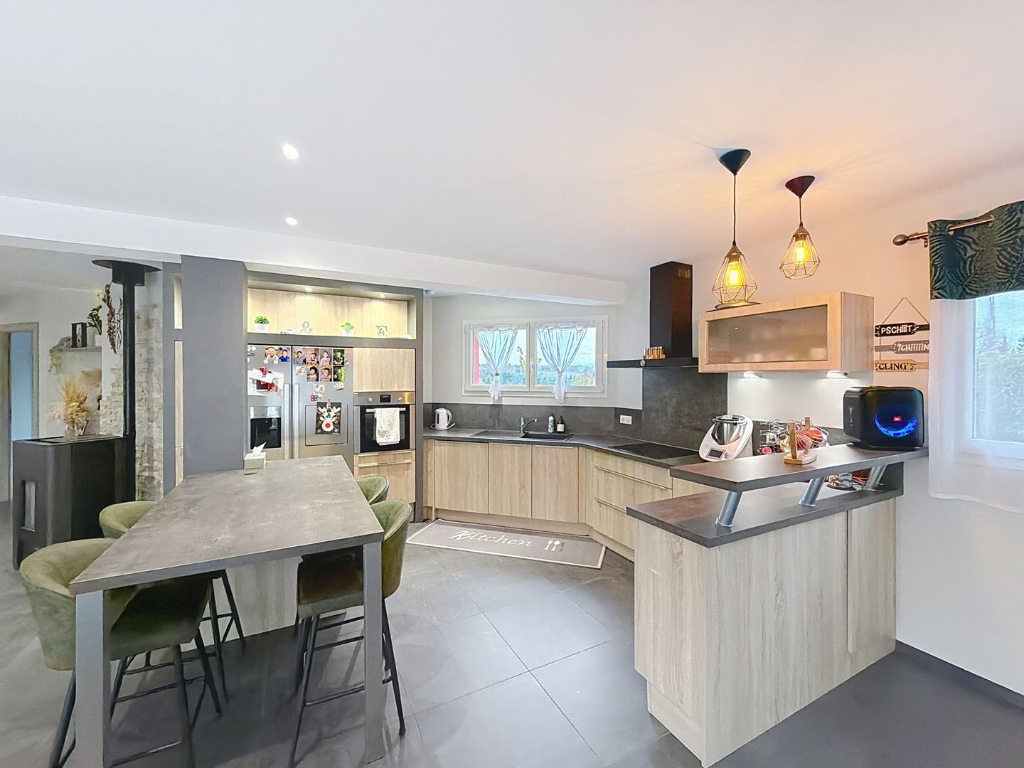 Elle se compose en rez-de-chaussée, d'une entrée dégagée, d'un salon/séjour ouvert sur cuisine équipée (avec accès direct à la terrasse et au jardin), d'une suite parentale comprenant chambre/dressing/salle de bains avec baignoire et douche, d'un cellier/buanderie et d'un WC. À l'étage: dégagement, trois chambres, salle d'eau avec douche et WC. Garage de 50m².