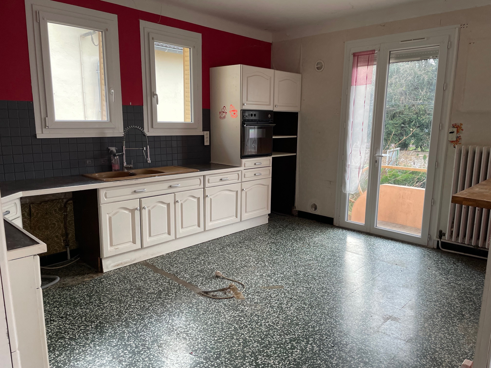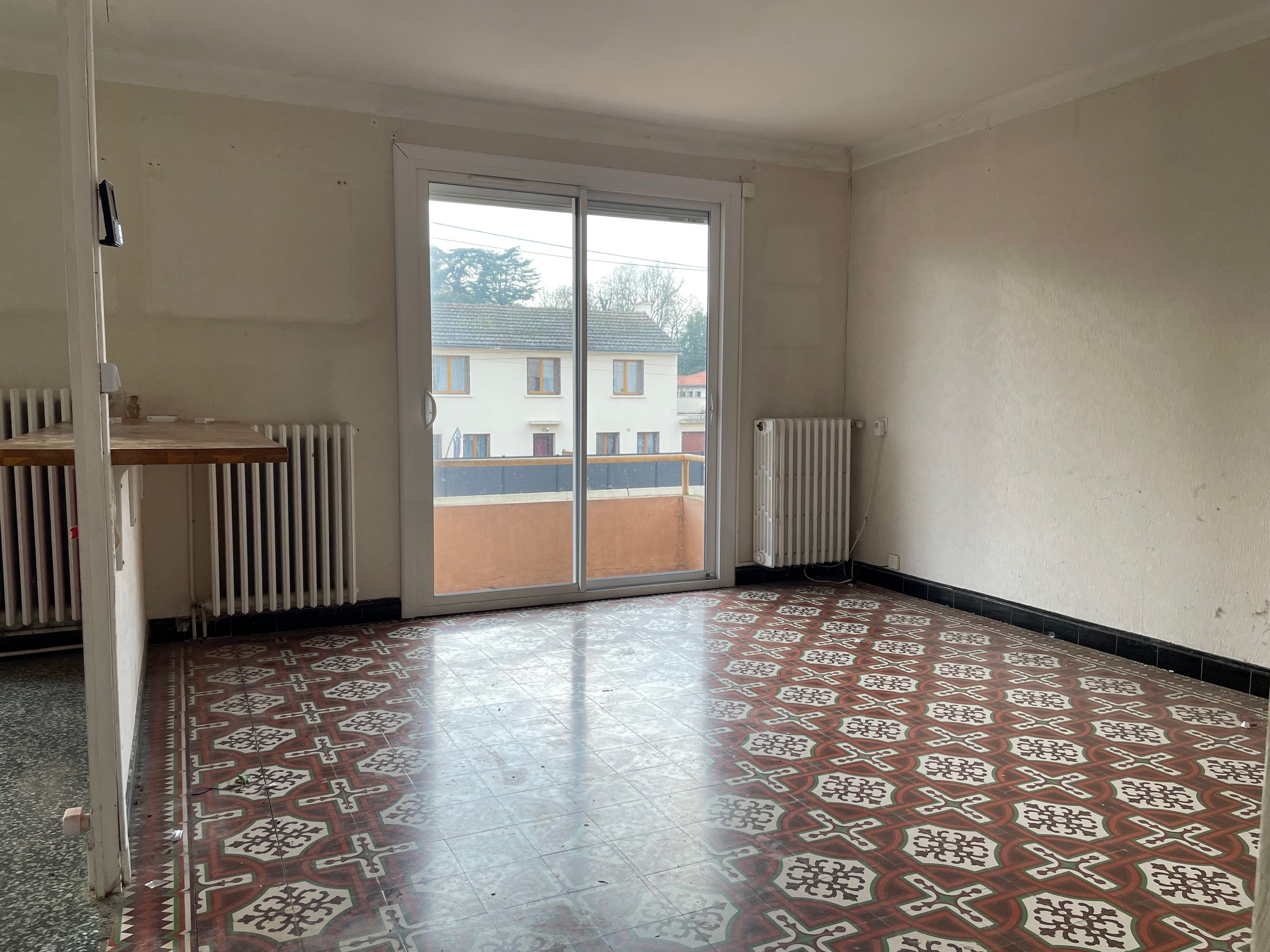 A l'étage : palier desservant cuisine aménagée ouverte sur séjour donnant accès à un balcon, 2 chambres, bureau, salle d'eau et WC -