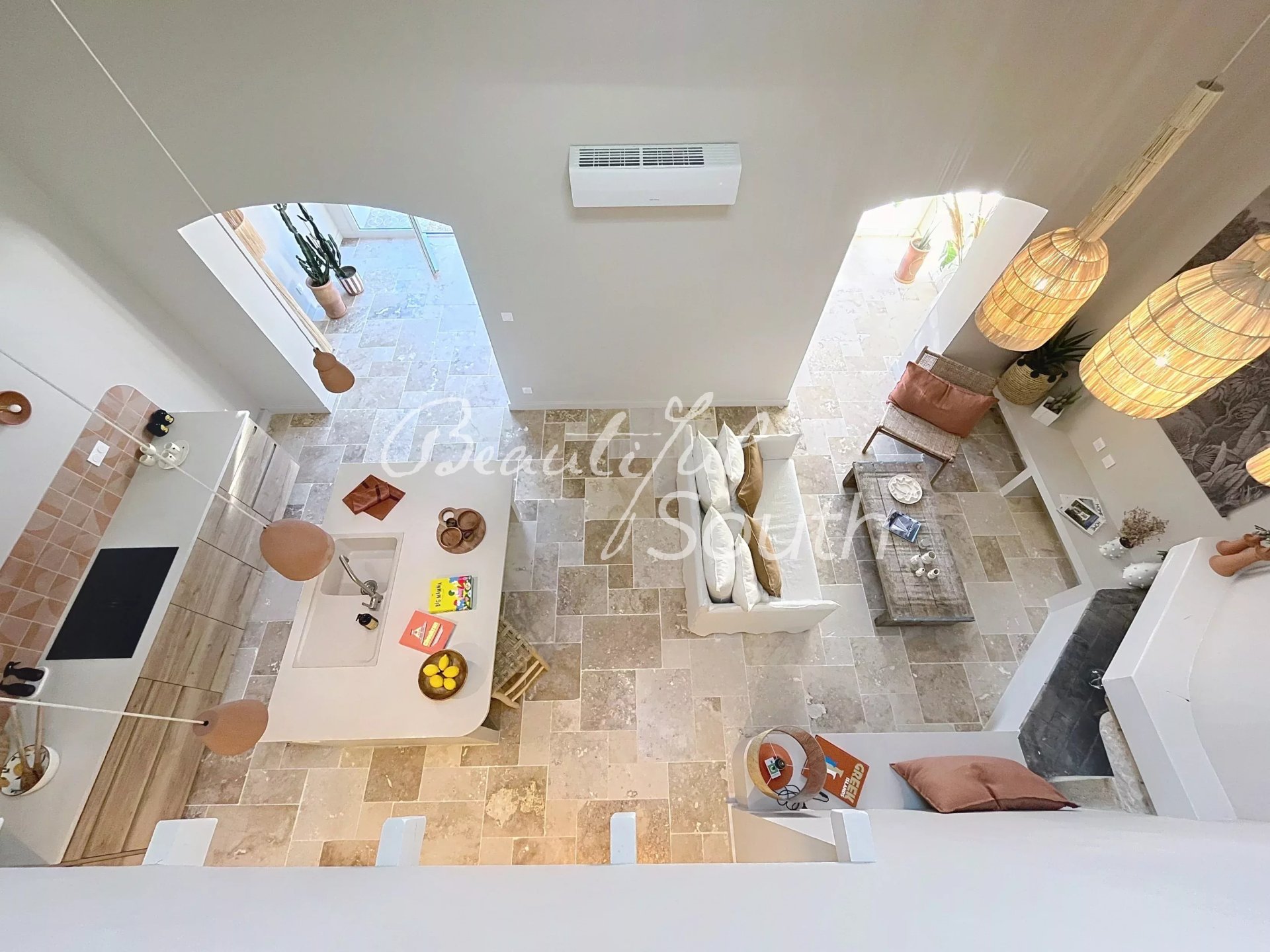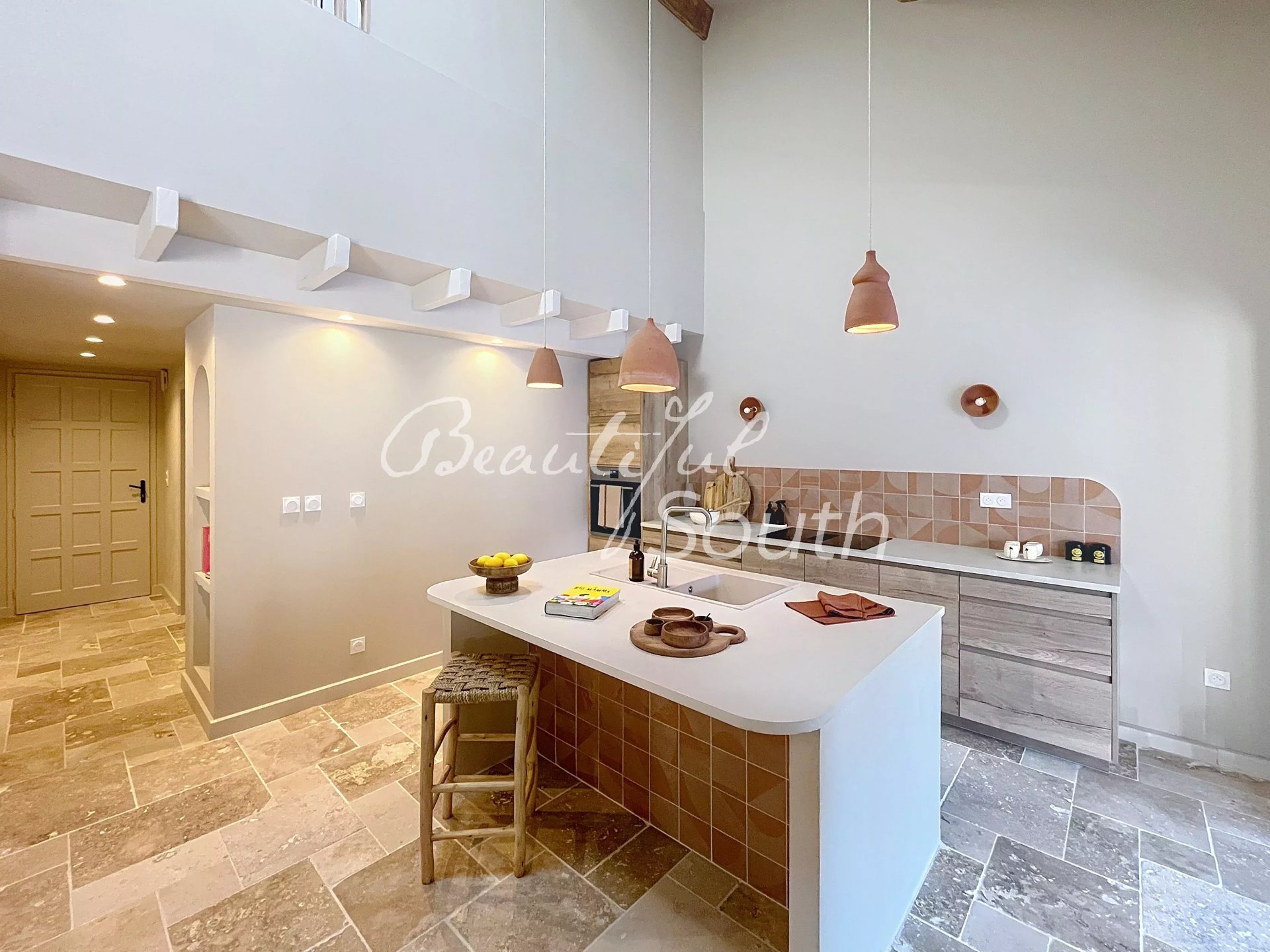 La pièce de vie, baignée de lumière, se distingue par un superbe séjour cathédrale agrémenté d’une cheminée, de poutres apparentes et d’une cuisine ouverte entièrement équipée. L’ensemble révèle une atmosphère méditerranéenne raffinée, mêlant harmonieusement bois brut, pierre naturelle, béton ciré, carreaux de ciment, terre cuite et enduit à la chaux. La palette de teintes douces — beige, blanc cassé et terracotta — enveloppe les espaces d’une ambiance chaleureuse et intemporelle, évoquant un art de vivre en vacances toute l’année.