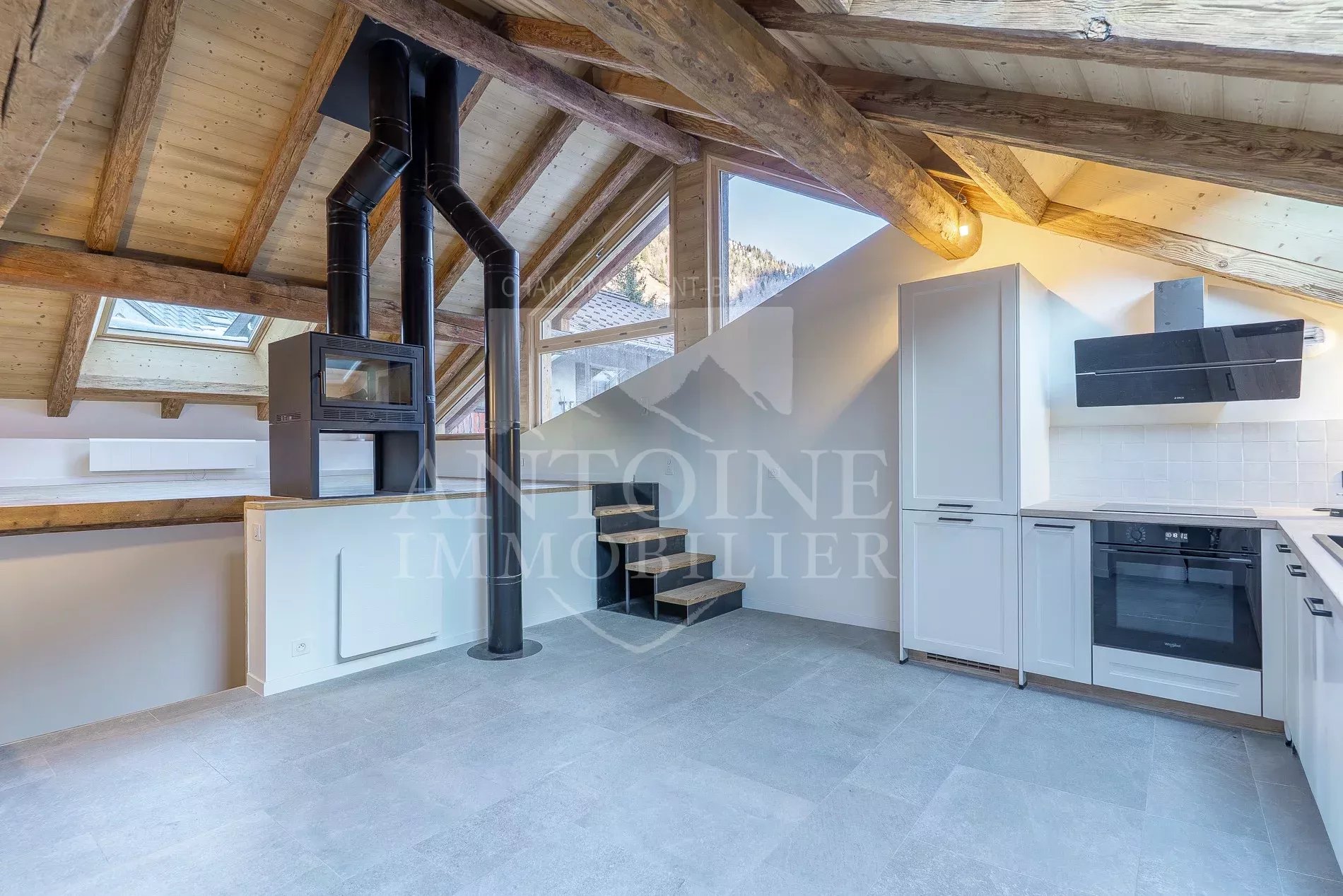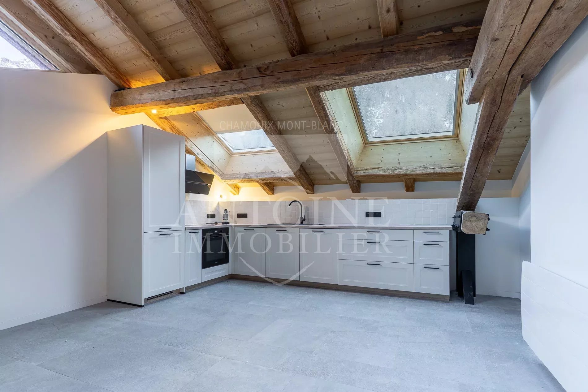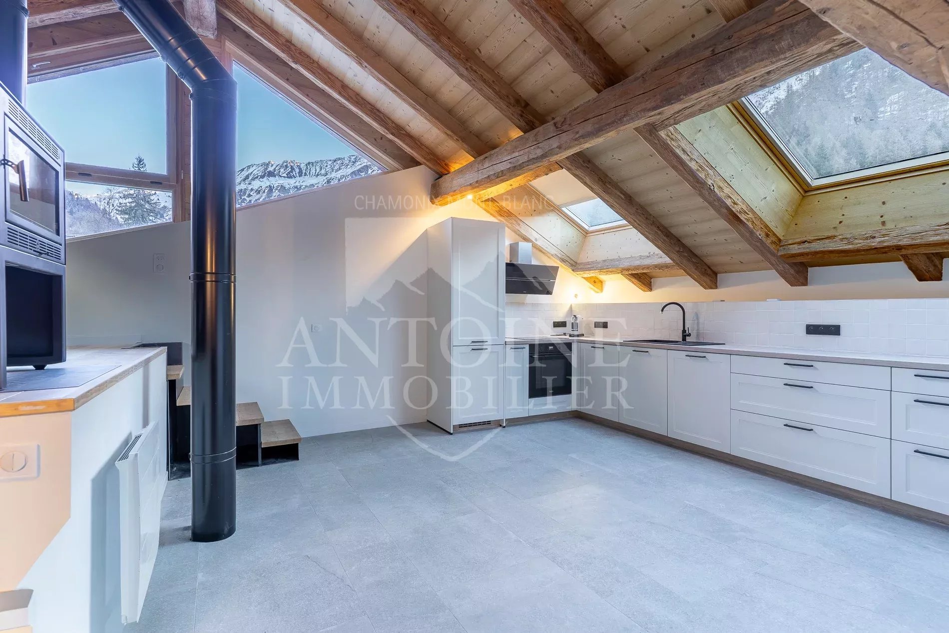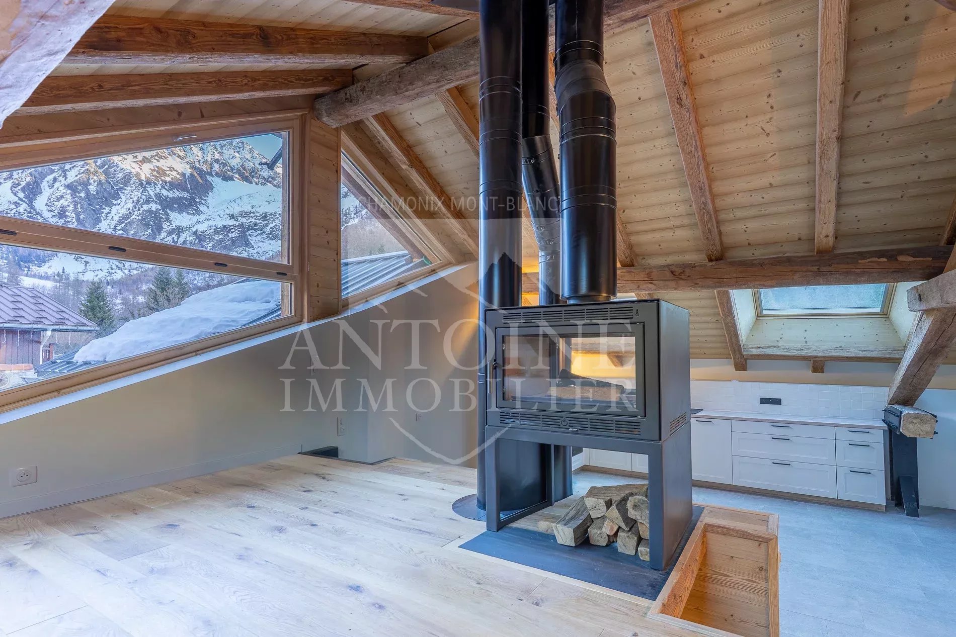Rénové entièrement à neuf, l’appartement bénéficie de prestations de qualité et de matériaux soigneusement choisis : poutres apparentes, charpente d'origine fabuleusement restaurée, carrelage type granit, électricité et sanitaires refaits à neuf, cuisine contemporaine, vitrage neufs, et poêle à bois central pour des ambiances chaleureuses. Le chauffage est électrique individuel. La performance énergétique est classée B ce qui est remarquable pour Chamonix !