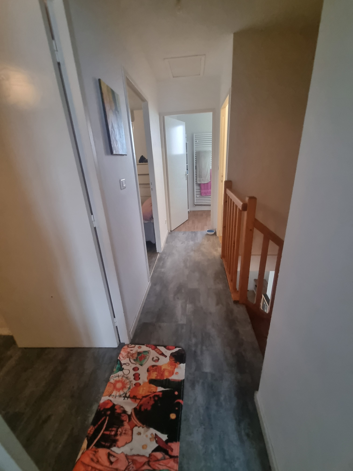À l'étage, un dégagement dessert une salle de bain de 4,5 m2, un WC séparé et trois chambres, toutes équipées de placards intégrés. Les surfaces sont bien réparties : 9 m2, 12 m2 et près de 10 m2. Un agencement pensé pour le confort de chacun au quotidien.