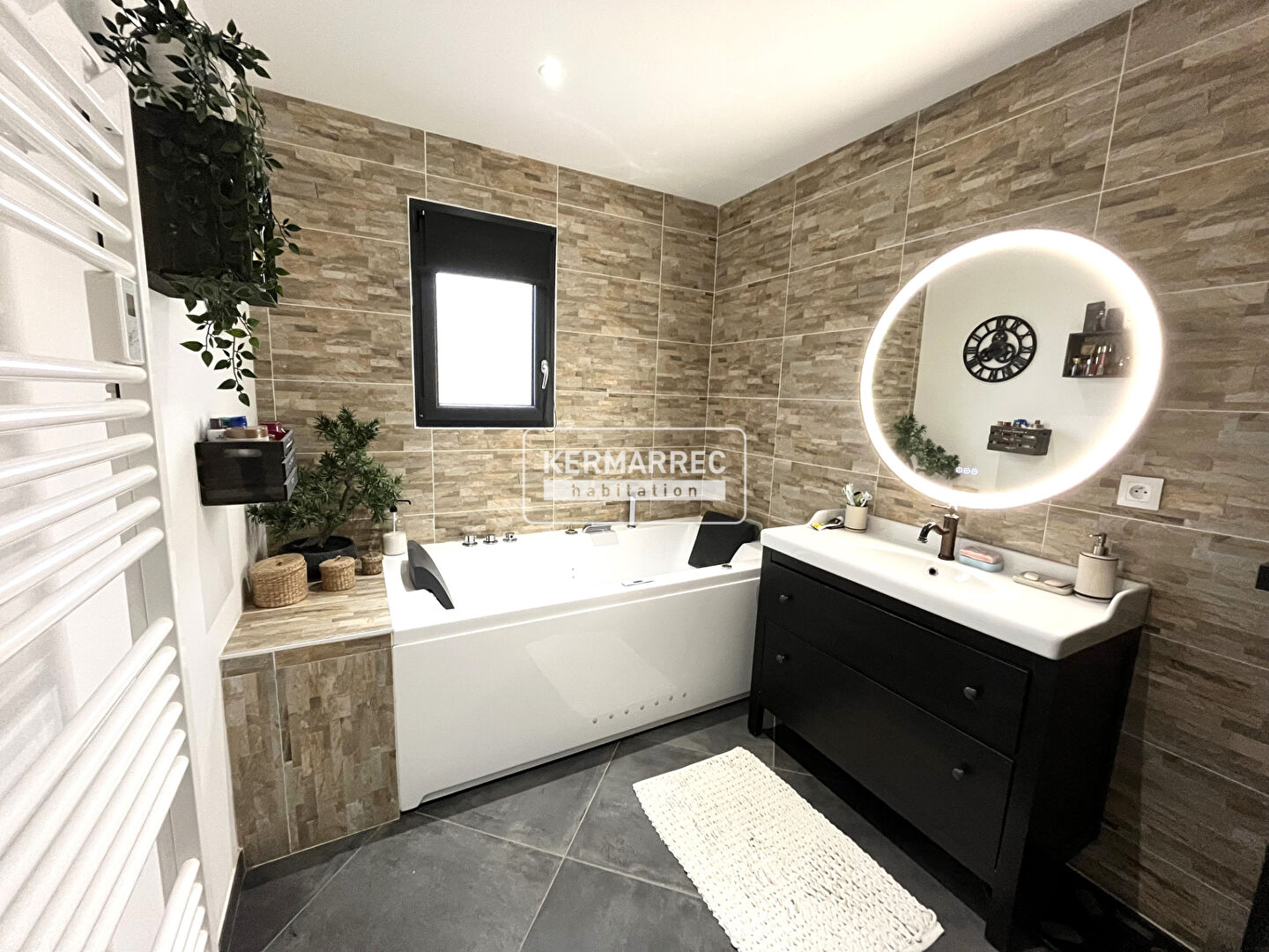 A l'étage un dégagement, trois chambres (une avec balcon sur jardin), une salle de bains avec baignoire balnéo et un WC indépendant.