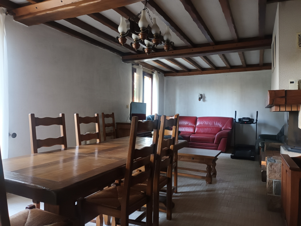-au-rez-de-chaussée : entrée, cuisine aménagée, séjour-salon avec cheminée insert, dégagement, deux chambres, salle de bains et wc séparés
