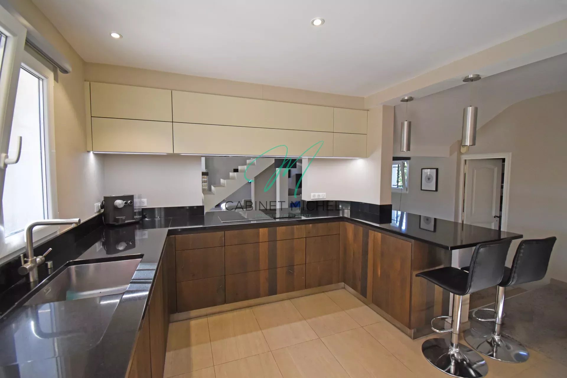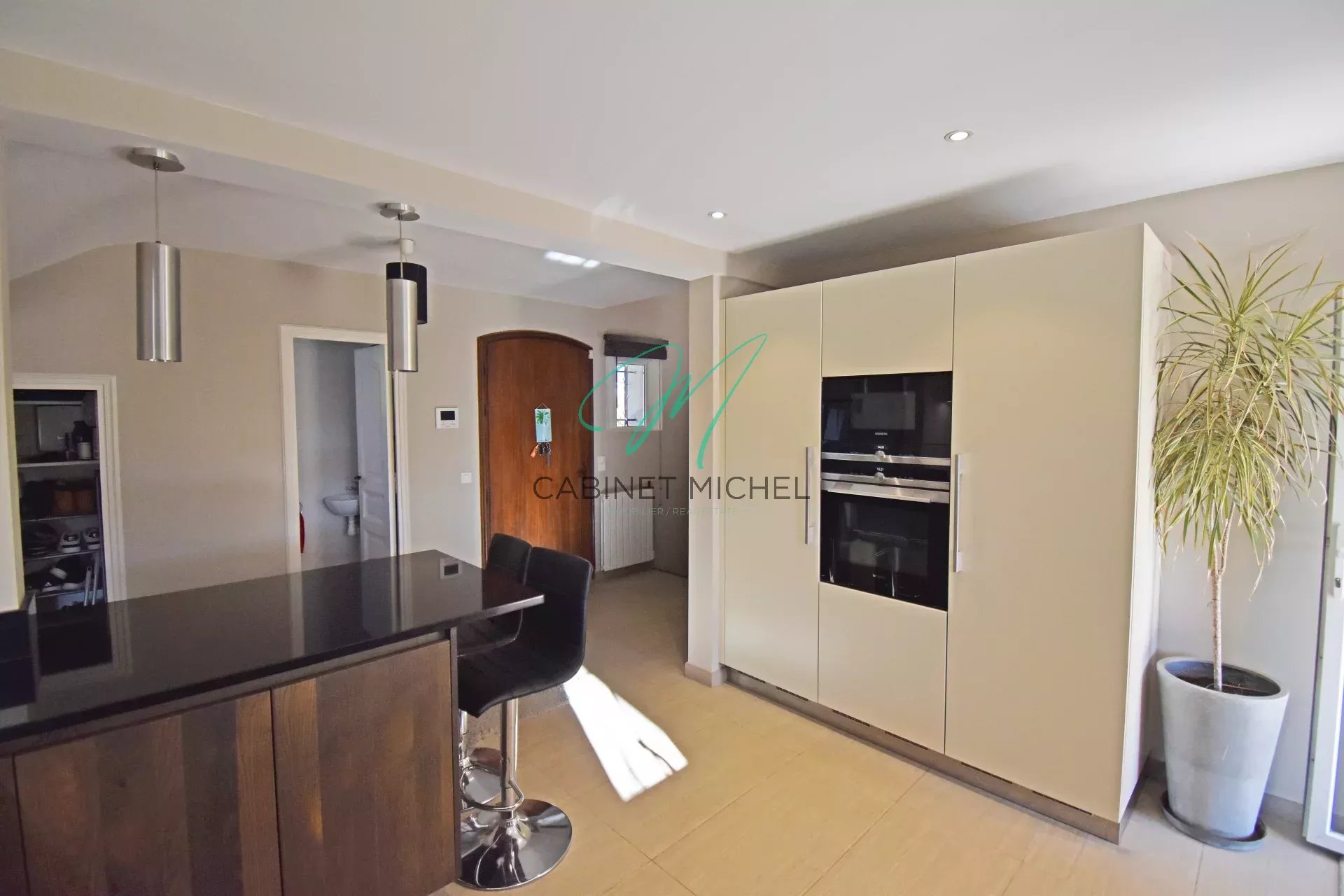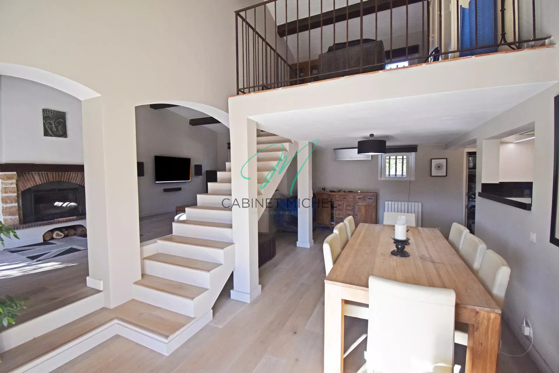 Au Rez-de-chaussée : d'une entrée ouvrant sur une cuisine semi-ouverte super-équipée avec meubles automatisés, séjour avec salle à manger et cheminée à insert, deux chambres et 2 salles de bains avec douche et wc ainsi qu’un WC indépendant avec lave-mains.