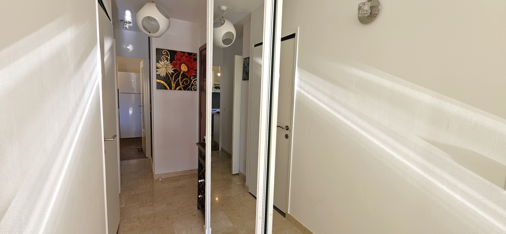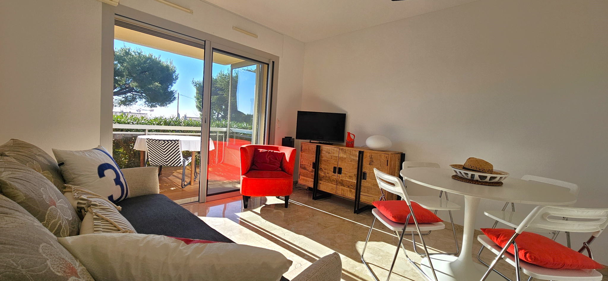 Dans une résidence fermée et sécurisée avec gardienne, ce grand studio transformé en véritable type 2 séduit par sa rénovation complète réalisée avec goût et soin. L'appartement offre un intérieur confortable et lumineux, équipé de la climatisation et du double vitrage, garantissant un excellent confort de vie en toute saison. La pièce de vie bénéficie d'une belle ouverture sur l'extérieur et d'une vue dégagée sur le parc arboré de la copropriété, avec de jolis aperçus sur la mer qui apportent une atmosphère particulièrement agréable. Exposé plein Sud, le logement profite d'un ensoleillement optimal tout au long de la journée. Vous apprécierez tout particulièrement la terrasse couverte de 9 m2 en bois marin, à l'abri du vent, idéale pour se détendre ou recevoir, dans un environnement calme et verdoyant. Une place de parking privative ainsi qu'une cave viennent compléter ce bien. Un appartement clé en main, parfaitement adapté aussi bien pour une résidence principale, un pied-à-terre ou un investissement locatif de qualité.
