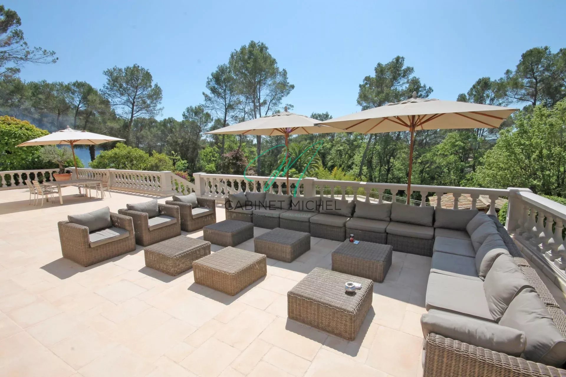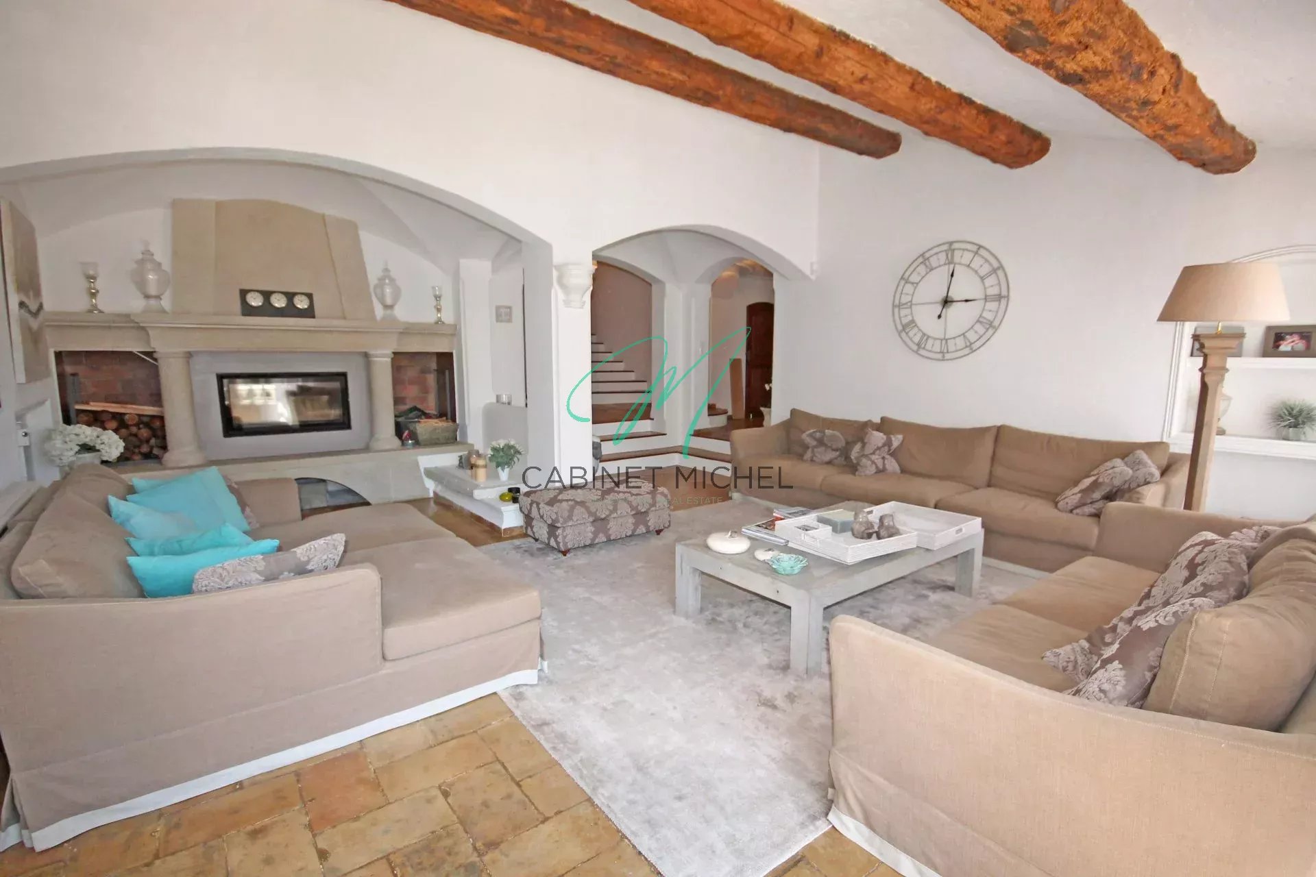 Située à l'abri des regards indiscrets, dans un secteur résidentiel, magnifique et spacieuse propriété bénéficiant d'une jolie vue dégagée et entièrement climatisée se composant d'un vaste hall d'entrée, réception avec cheminée avec coin bureau, cuisine dînatoire avec lingerie et cellier, grande salle à manger, espace bar le tout ouvrant sur une très grande terrasse surplombant l'espace piscine.