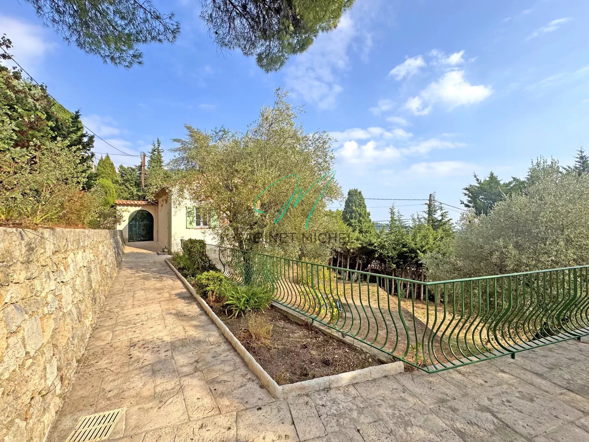 En rez-de-jardin, trois chambres avec placards, une salle de bains, une salle de douche, deux wc séparés. Terrain complanté d’oliviers de 2616 m² en restanques, grand garage, parking, chambre indépendante avec salle d’eau et wc sous combles. Chauffage gaz de ville, double vitrage, prestations intérieures de qualité. Rare sur le secteur !