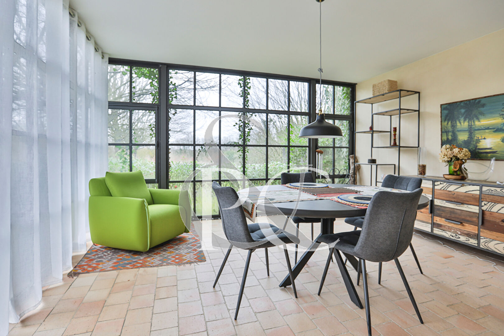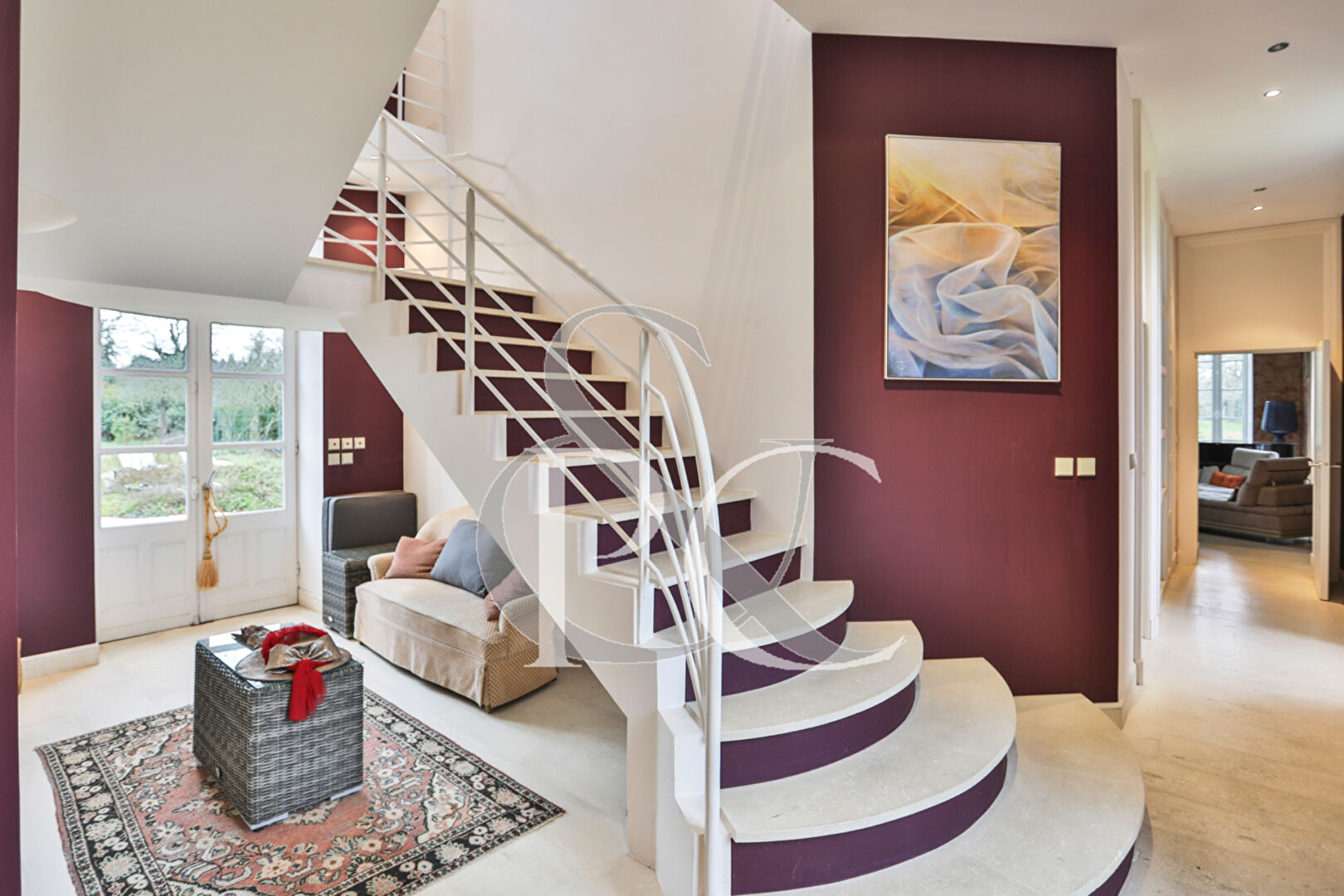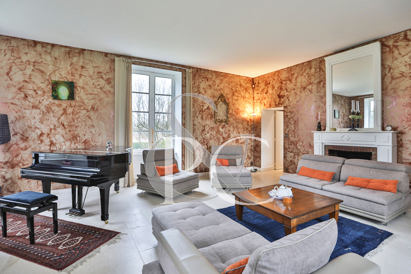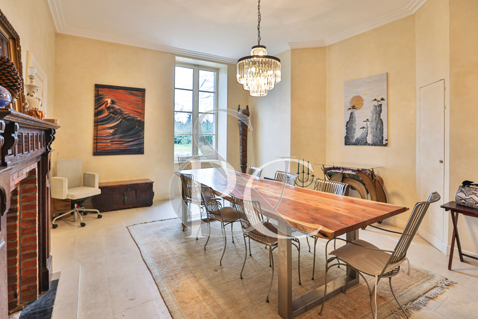 Dès l'entrée, les espaces de réception se succèdent avec fluidité : salle à manger avec poêle, deux salons avec cheminée et bibliothèque, vaste séjour, ainsi qu'une verrière ouverte sur le parc, offrant de belles perspectives sur la nature environnante.