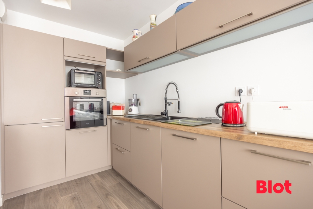 La pièce de vie, lumineuse, s'ouvre sur une terrasse exposée plein sud. La cuisine, moderne, aménagée et équipée, complète l'ensemble.