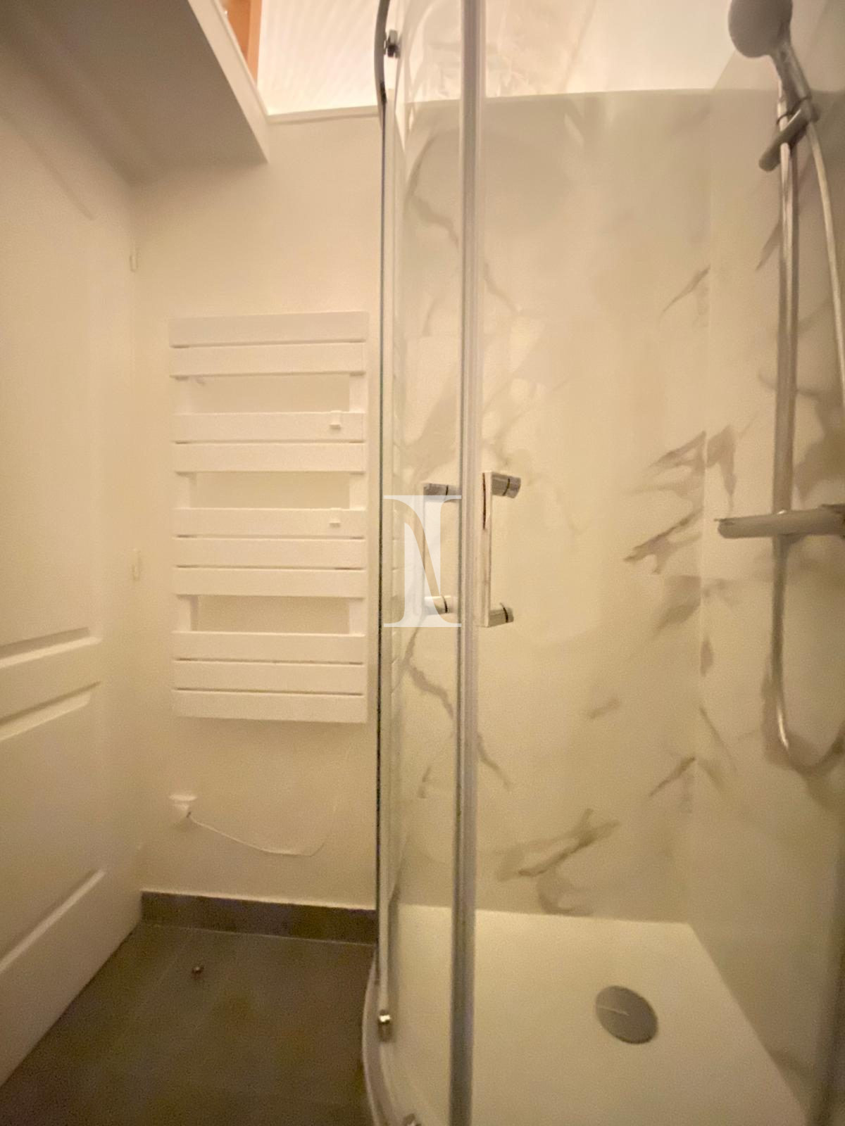 La salle d'eau avec WC, moderne et fonctionnelle. La hauteur sous plafond de 2,80 m apporte une sensation d'espace et de luminosité.