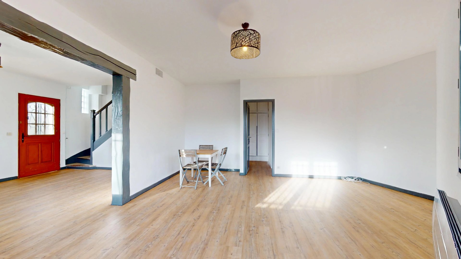 À l’étage, le palier distribue une grande chambre d’environ 13 m² et une salle d’eau avec toilette, offrant un espace nuit confortable et bien distinct.