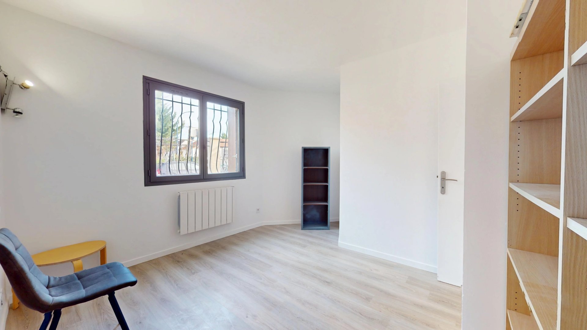 Sur ce même niveau, un couloir avec rangement dessert une première chambre de près de 12 m², une salle de bains avec baignoire menant à un toilette indépendant, le tout de plain-pied.