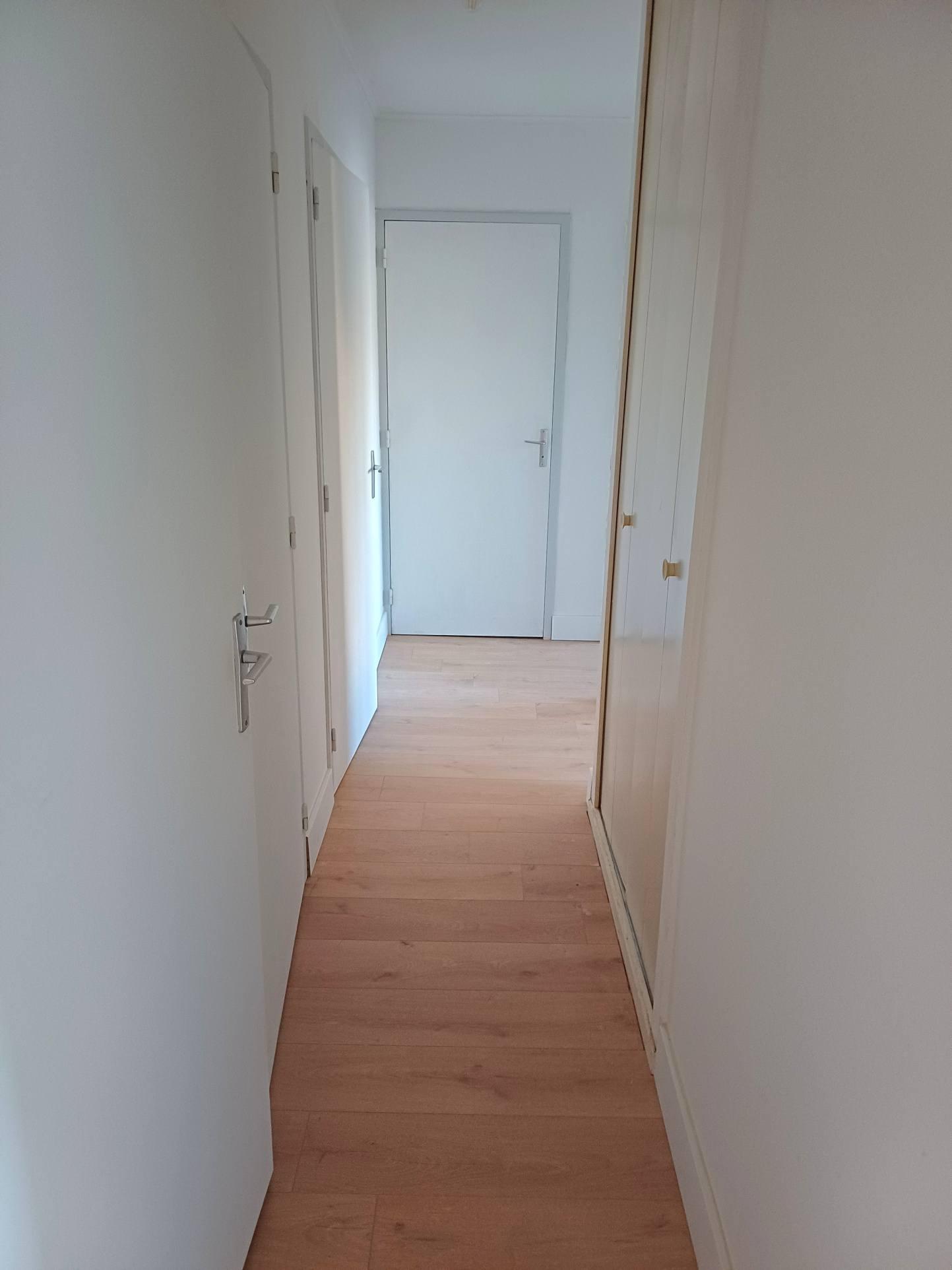 Cet appartement est situé au cinquième étage, et offre une vue dégagée depuis le balcon. Il comprend deux chambres, un séjour et une cuisine, pour une surface de 63 m2 environ.