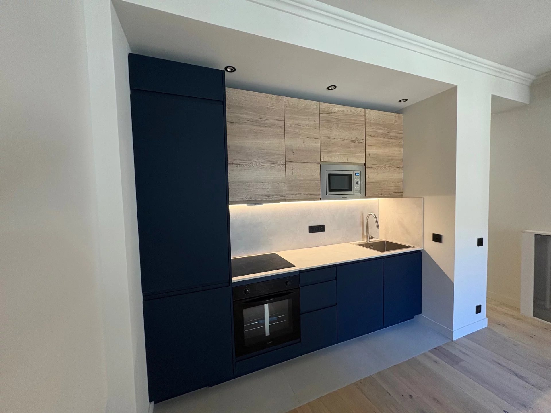 Parquet, séjour avec cuisine US, placard, climatisation.