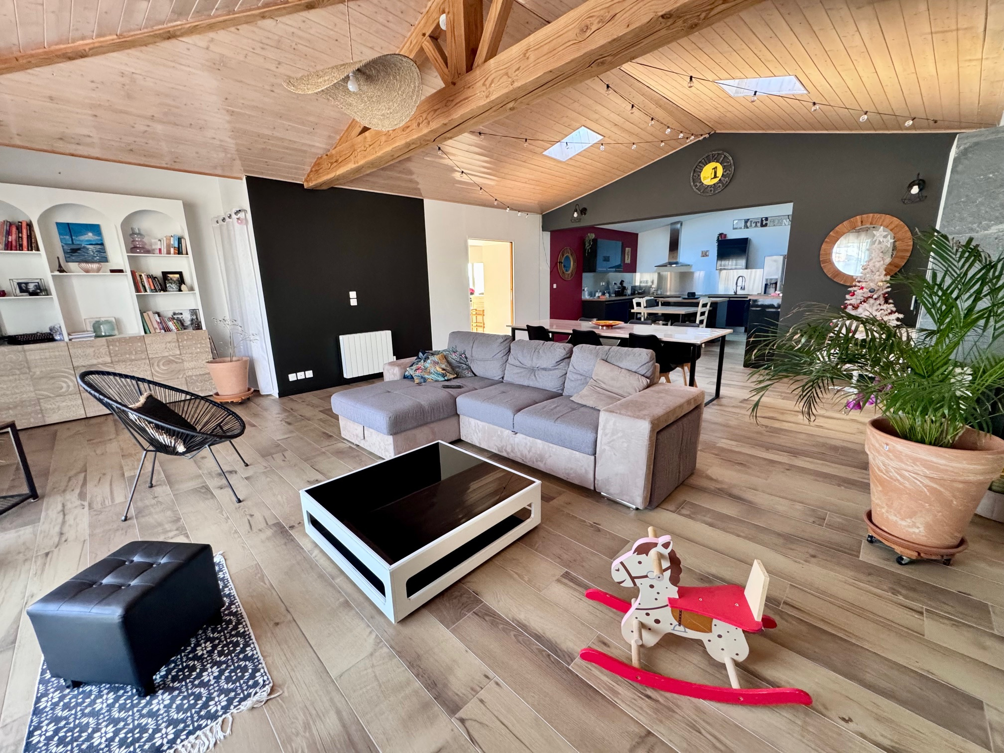 Au rez-de-chaussée, vous serez séduit par une spacieuse pièce de vie de 70 m2, comprenant une cuisine aménagée et équipée ouverte sur le séjour, agrémenté d'un poêle de masse apportant chaleur et convivialité. Cet espace est complété par une buanderie, deux chambres avec placards (12,8 m2 et 14 m2), un espace bureau (offrant la possibilité de créer une salle d'eau) ainsi qu'un WC indépendant.