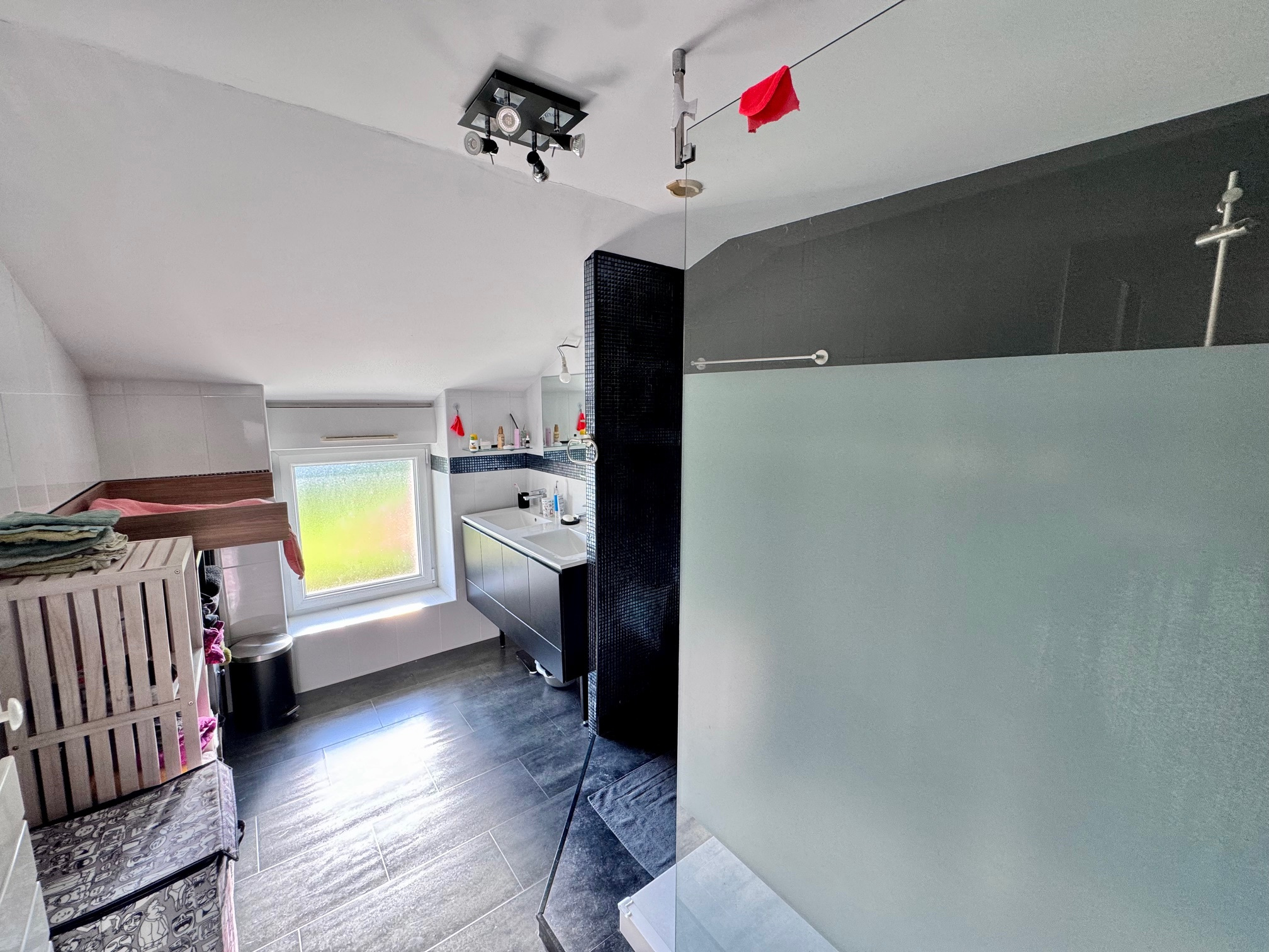 L'étage accueille une chambre de 14 m2, une salle d'eau et un WC.