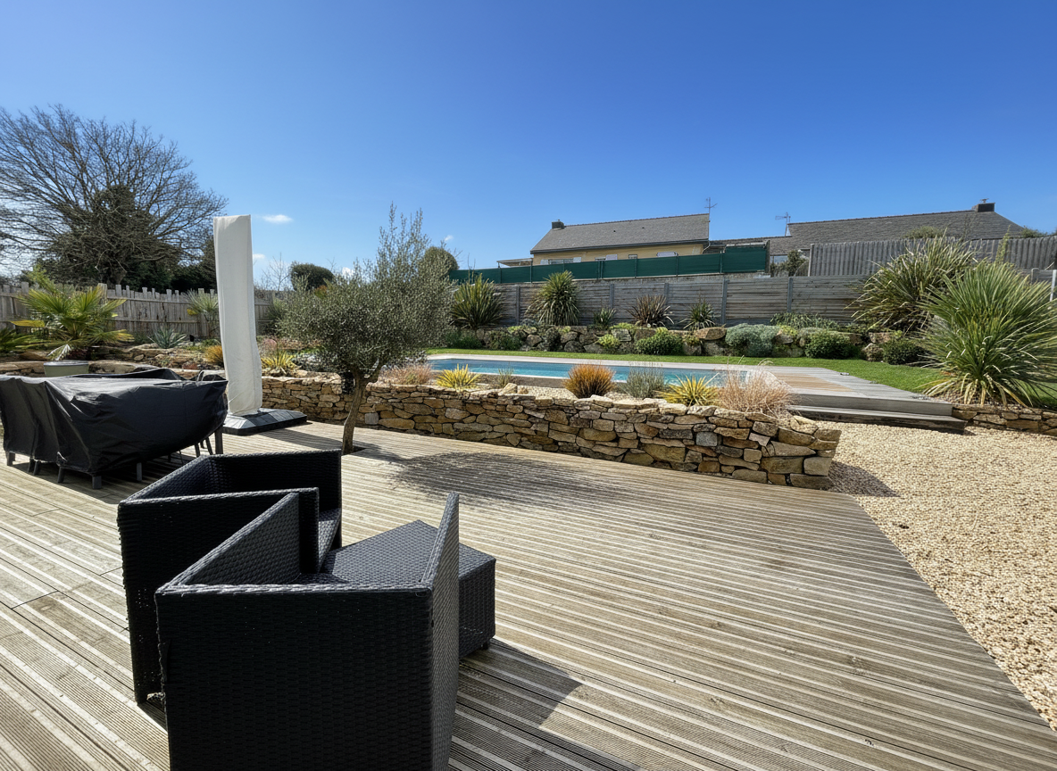 Le jardin paysagé et structuré prolonge cette sensation de calme et d'intimité. Un espace barbecue, une belle terrasse bois se prolongeant sur les abords de la piscine chauffée, deux places de stationnement sur le devant avec un proche d'entrée, reflètent un esprit bien pensé.