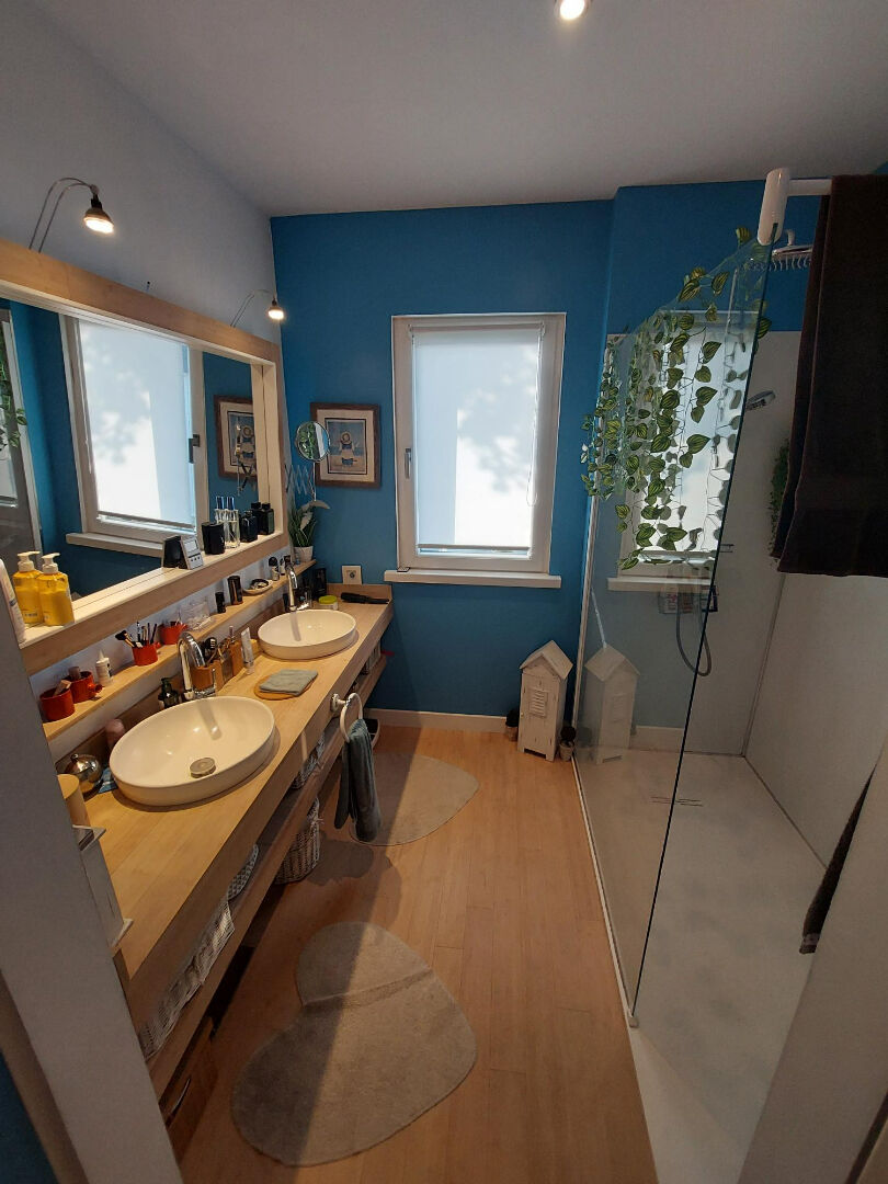 hall d'entrée, sanitaire, pièce de vie avec accès terrasse (baie coulissante), cuisine aménagée et équipée (26 M2) arrière cuisine 2 chambres avec dressings, salle d'eau - sanitaire