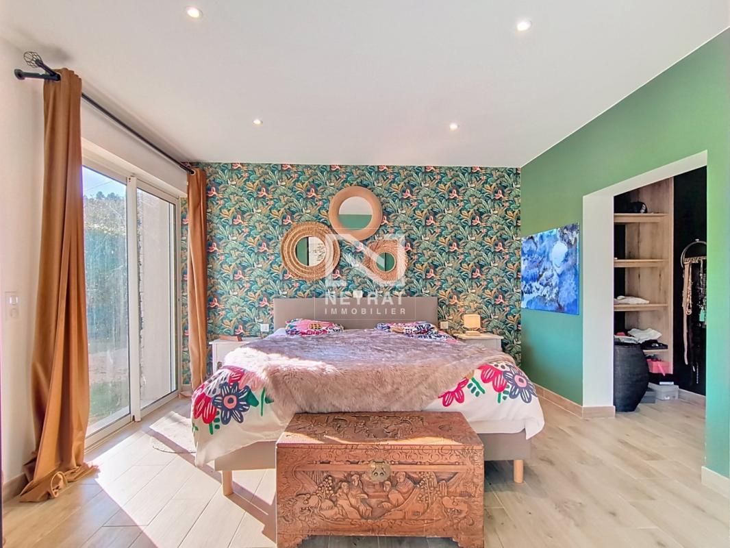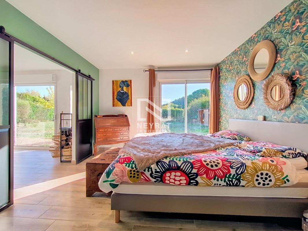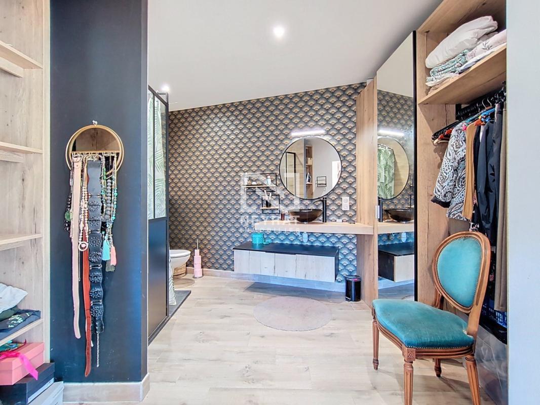 À l'étage, un bureau pouvant être aménagé en chambre, une suite parentale avec salle d'eau, dressing et terrasse privative avec vue sur la végétation.