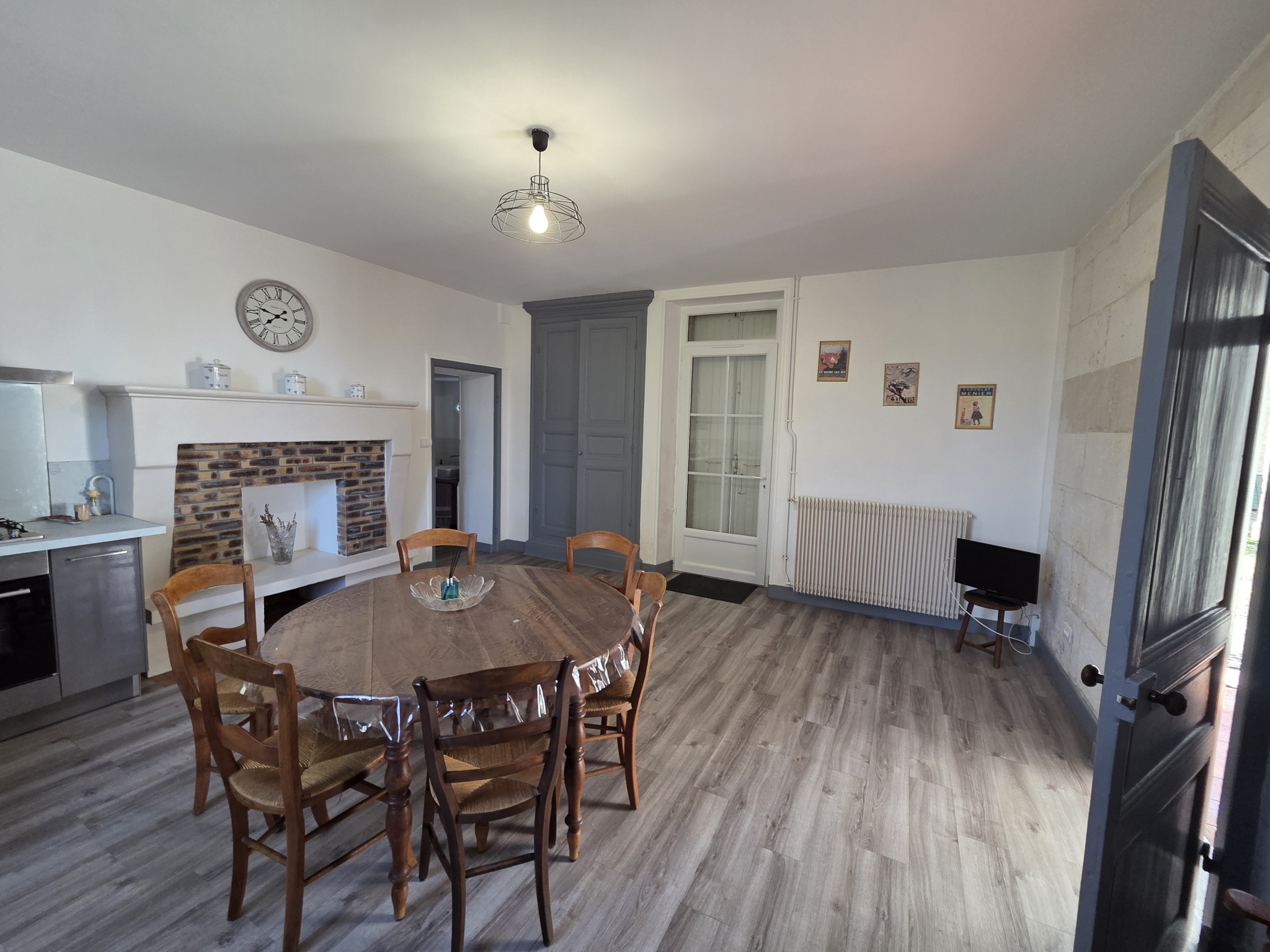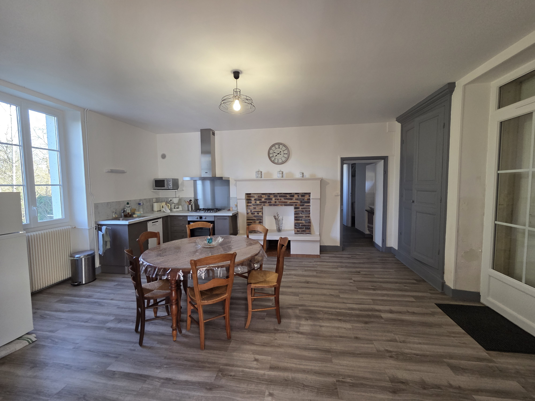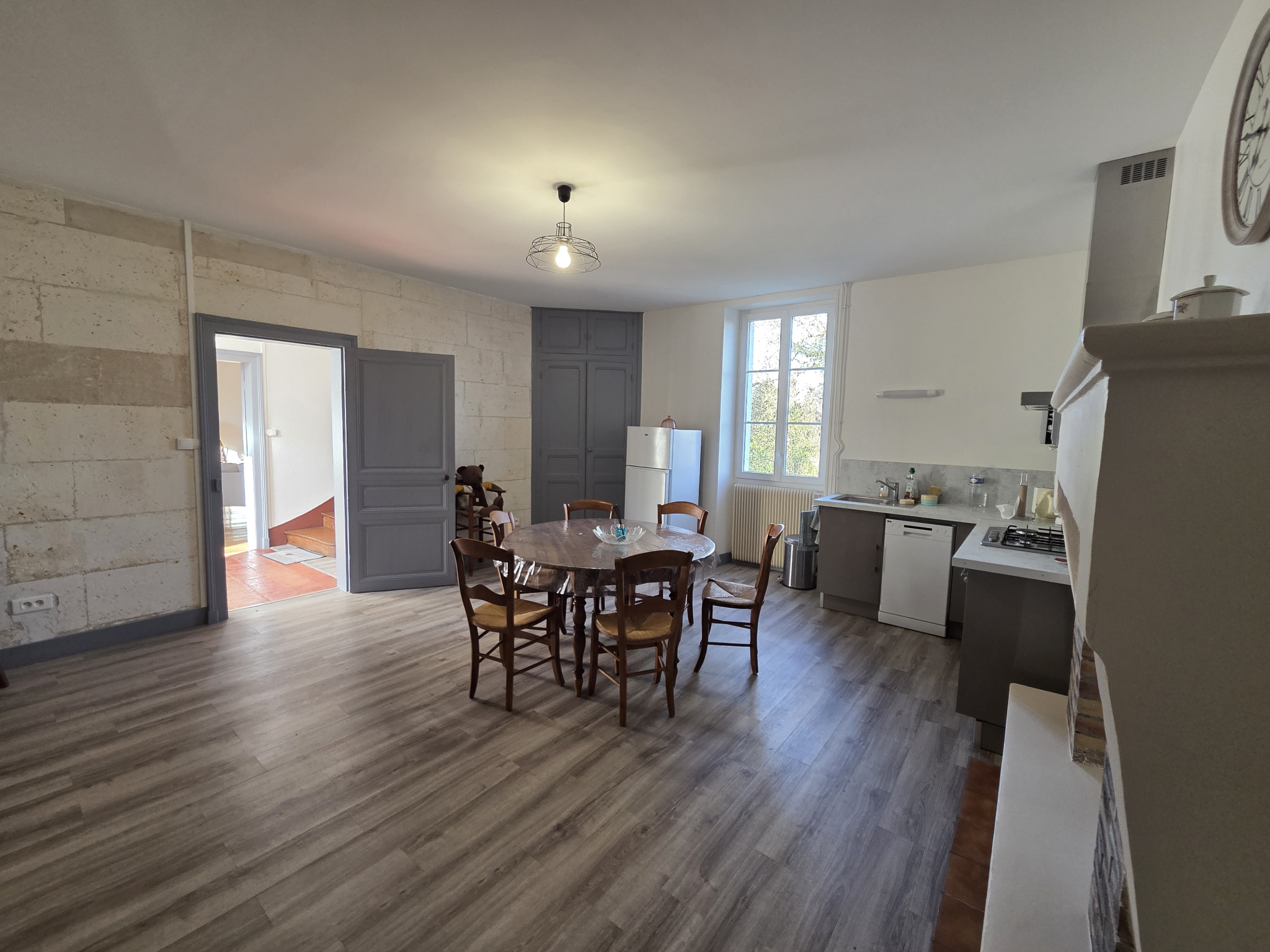 La maison principale exposée plein sud se compose au rez de chaussée : d'une belle entrée , d' une cuisine aménagée et équipée avec coin repas de 26 m2 environ avec lumière traversante , d' un salon avec cheminée de 25 m2 , d'une salle d'eau et d'un wc.