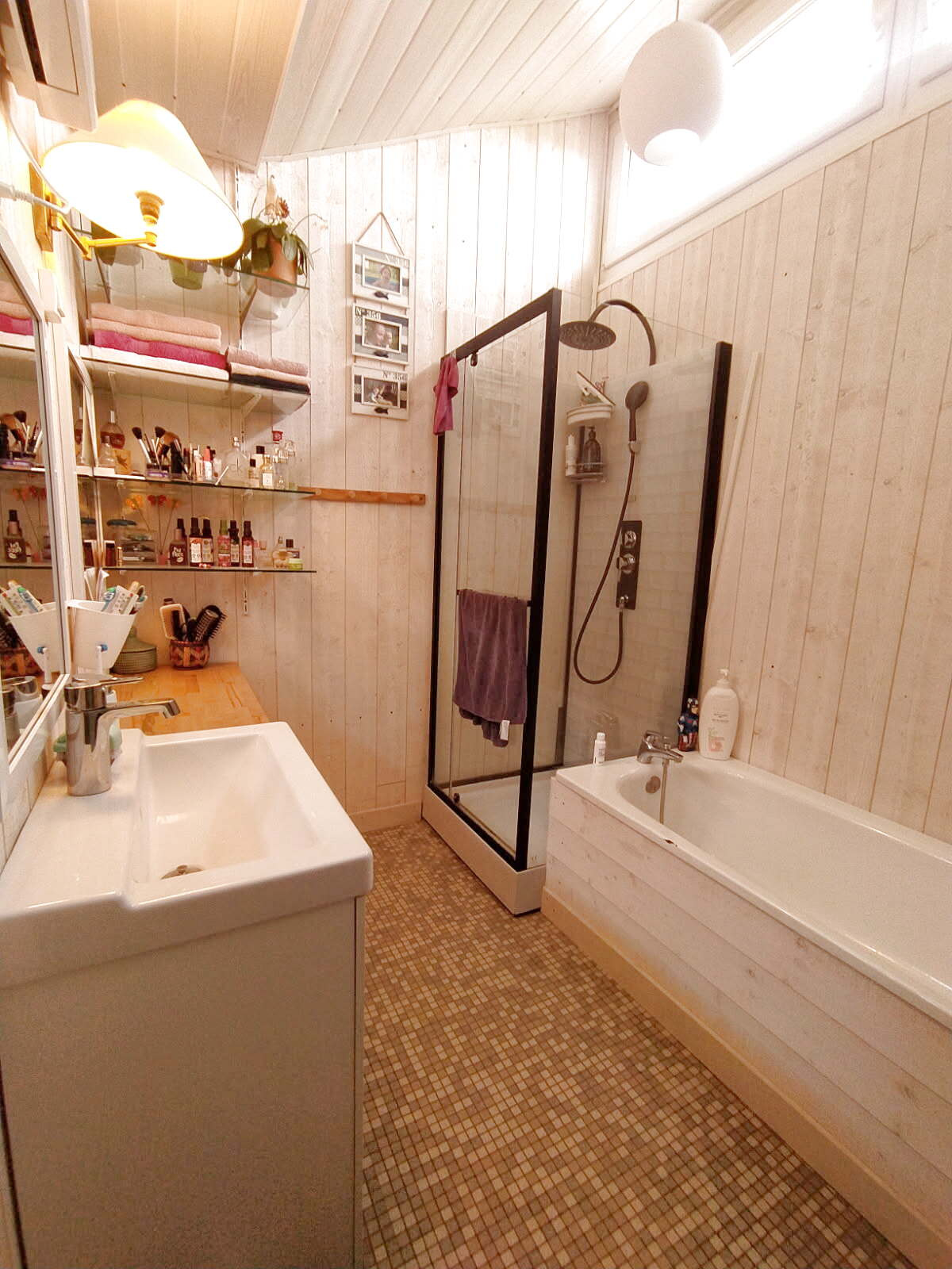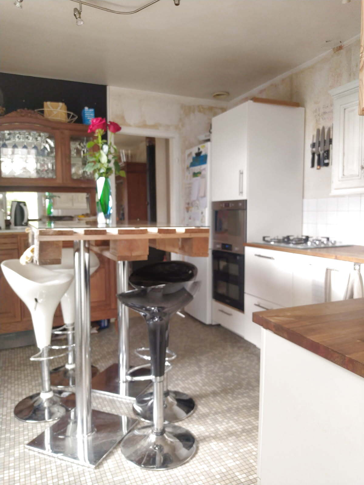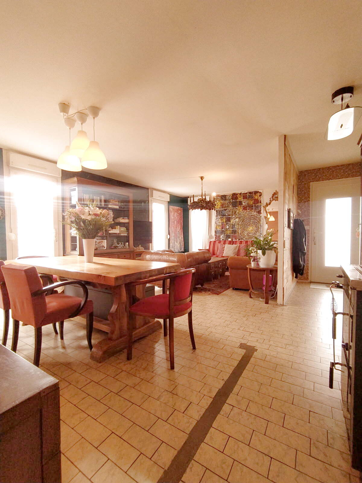 - Au RDJ : sas d'entrée, toilettes, salle à manger ouverte sur salon, cuisine aménagée, couloir, trois chambres dont une avec grand dressing, salle de bains avec douche et baignoire, verrière couverte et en partie ouverte.