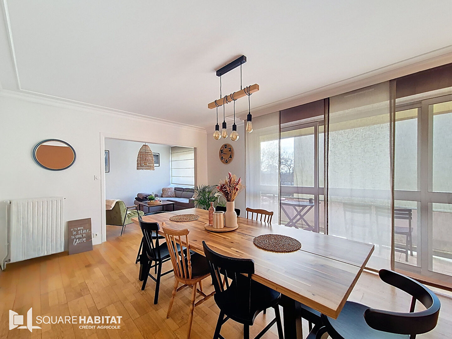 une entrée avec placard, salle à manger donnant sur un balcon, salon, cuisine aménagée et équipé avec son balcon, un couloir desservant wc, Salle d'eau et trois chambres dont une avec un beau dressing.