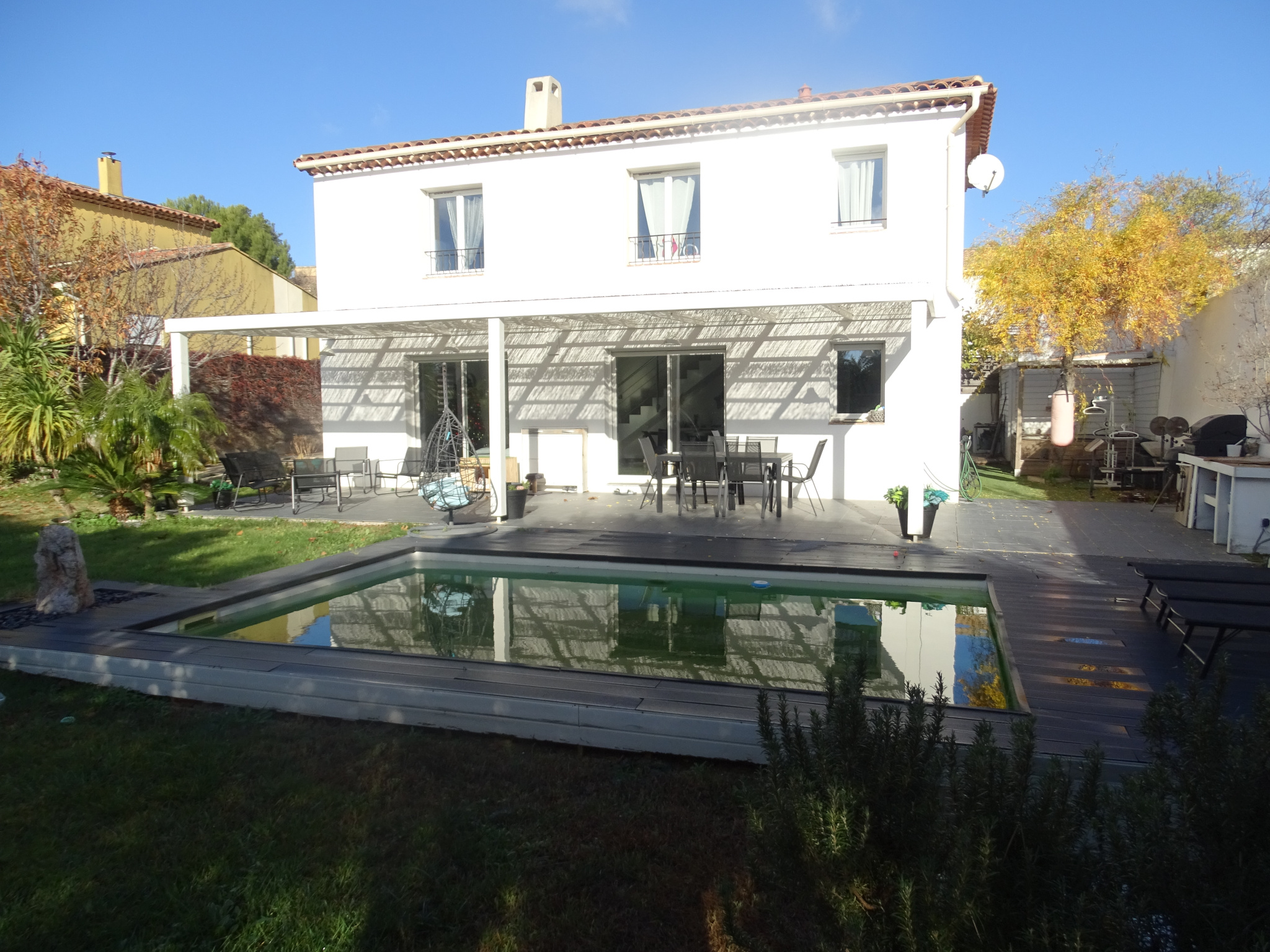 Grand jardin avec piscine. Le tout sur une parcelle d'environ 650 m2 . A proximité des ecoles, des transports et des ecoles.