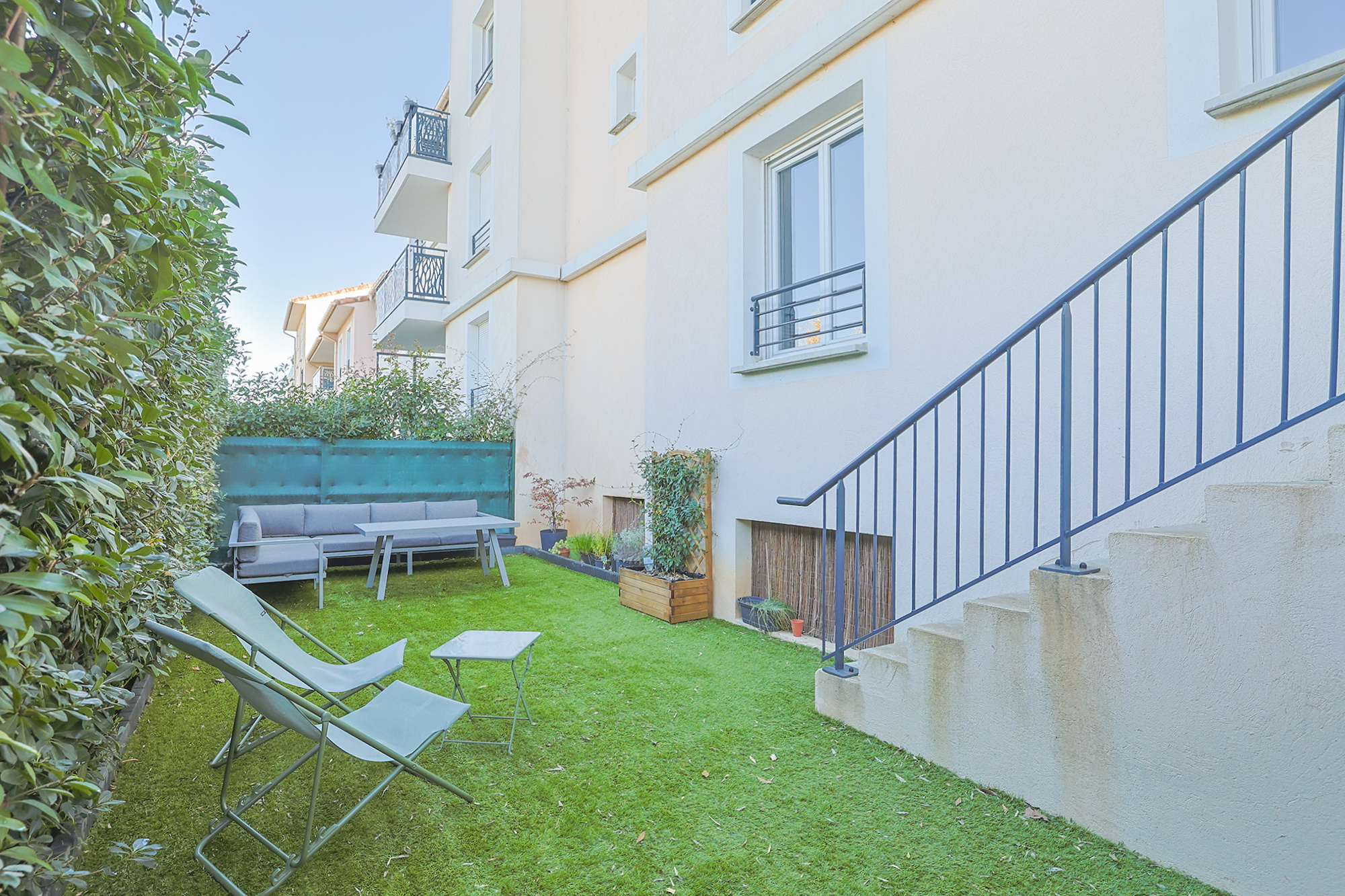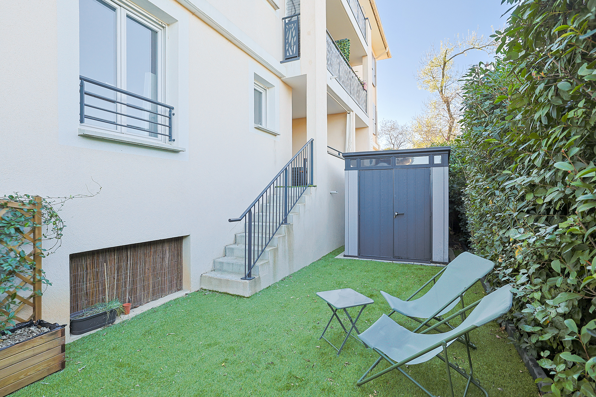 - l'autre un niveau en dessous, spacieux et clôturé, comprenant un cabanon pour stocker du matériel, un coin salon de jardin et le tout sans vis-à-vis ni balcon au-dessus.
