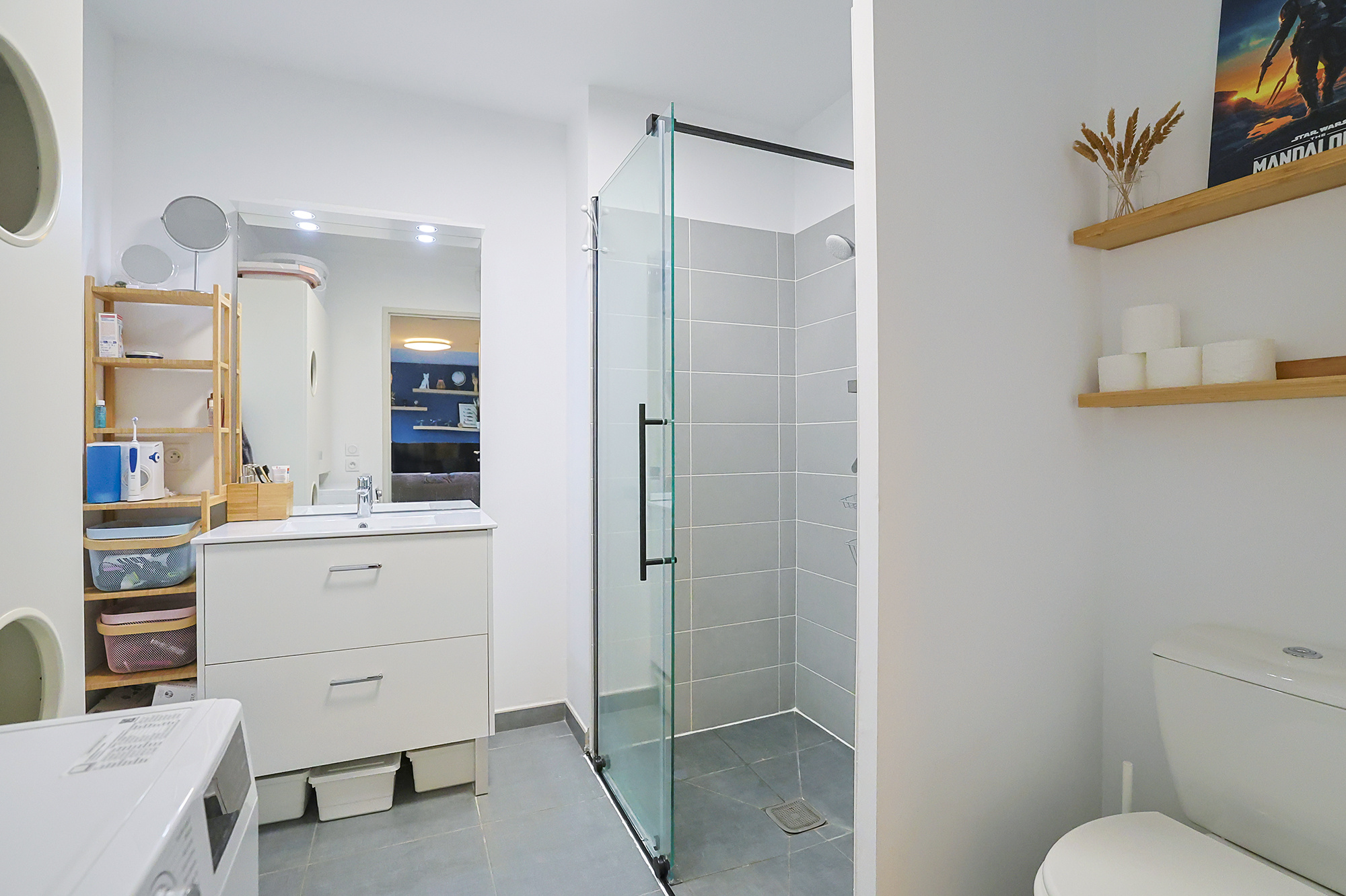 - d'une salle d'eau entièrement équipée : douche à l'italienne, meuble vasque, wc, carrelage et faience.