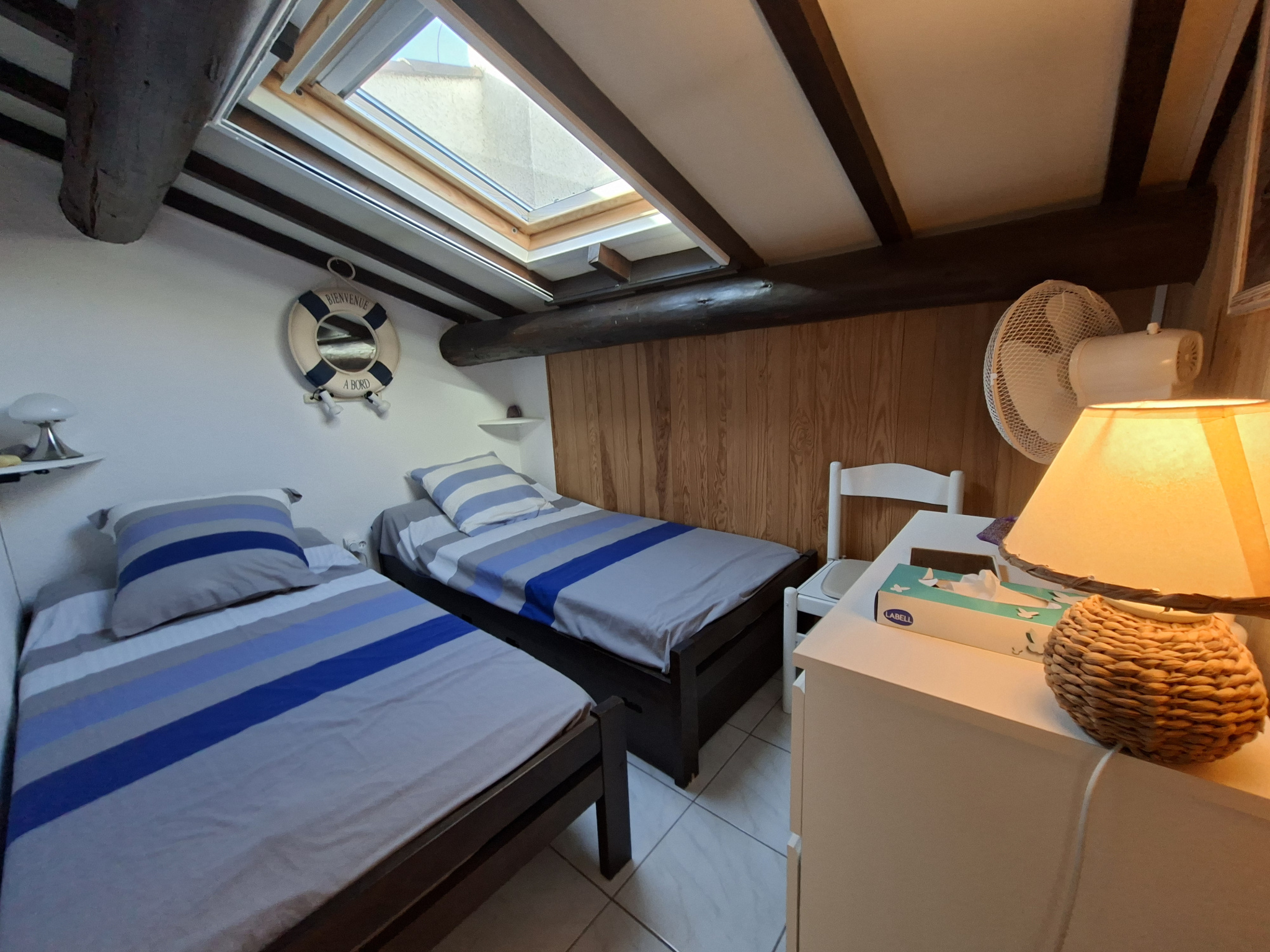 À l'étage, ce bien dispose de deux belles chambres avec couchage double chacune, la première chambre offre une petite vue mer. un emplacement parking se trouve en face de la villa.