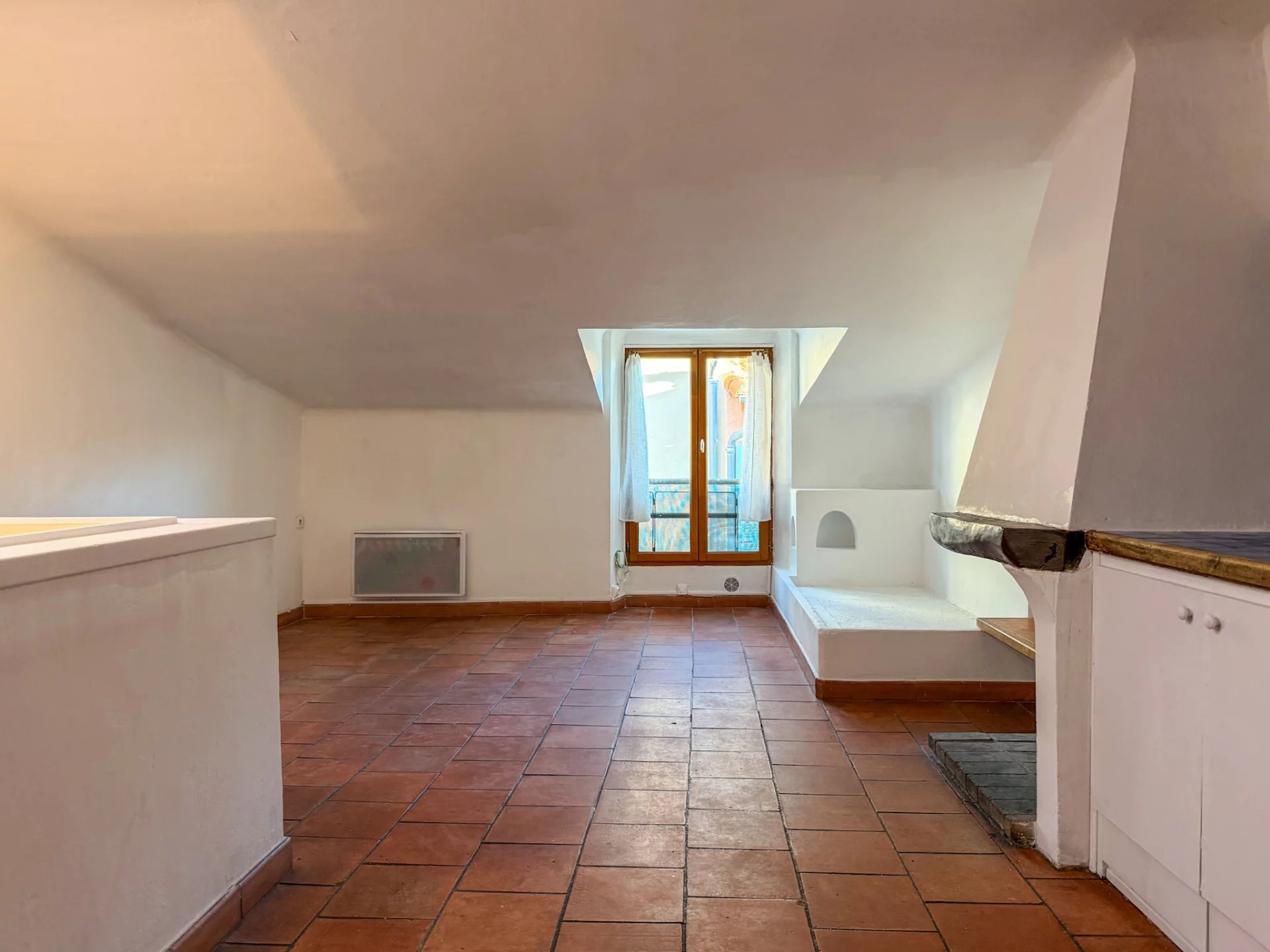 1er étage : studio de 31,90 m² avec séjour et cuisine ouverte, coin nuit, salle d’eau, WC séparés, débarras