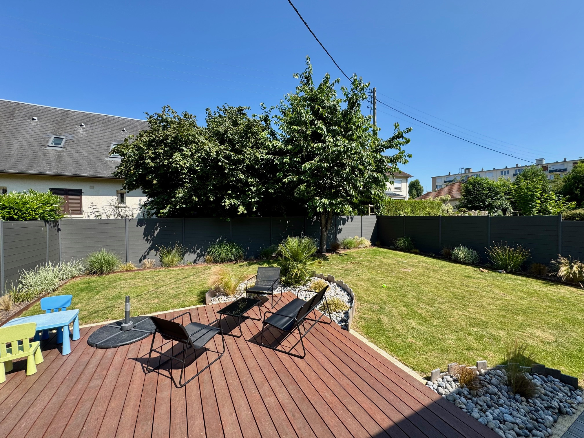 Le jardin clos et paysagé se trouve à l'opposé de le la rue, il est agrémenté d'une belle terrasse en bois exotique de 40m2 ensoléillée.