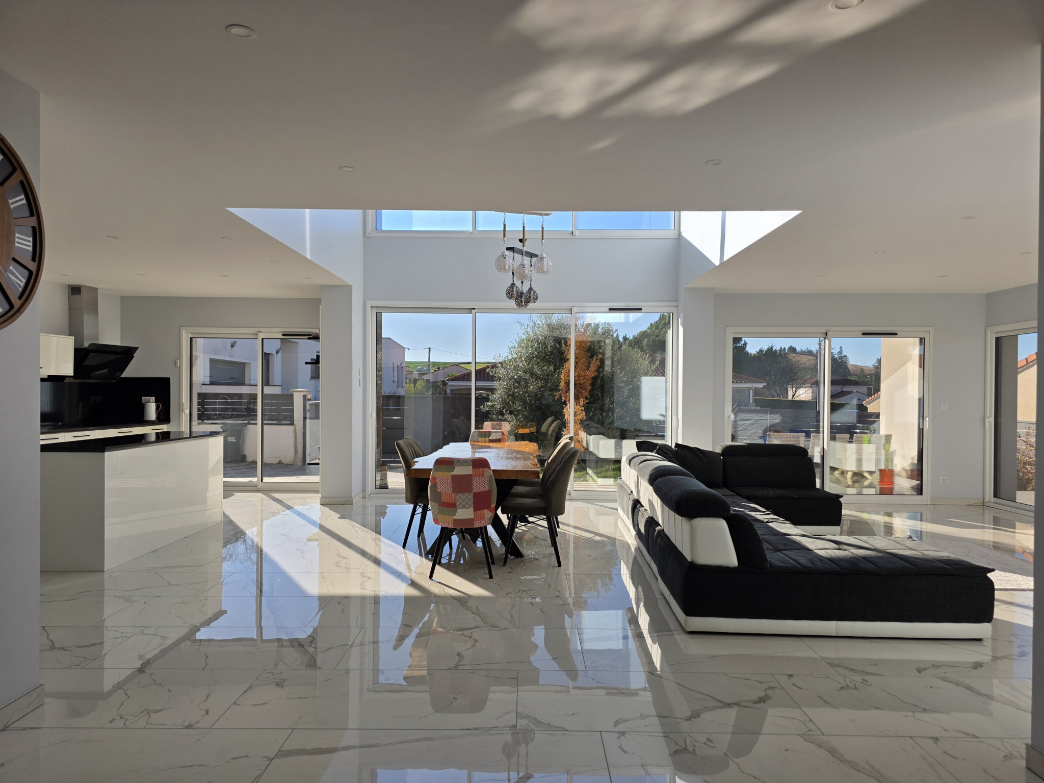 D'une luminosité rare, la maison s'ouvre sur une belle pièce de vie de 72m2 exposée sud proposant une cuisine haut de gamme entièrement équipée avec plan de travail en granit, un espace salle à manger et un coin salon avec le Puy-de-Dôme en fond. Ce niveau vous offre également une chambre de 12m2 avec placard, une salle d'eau avec douche et WC, un cellier, une buanderie et un garage de 19m2.
