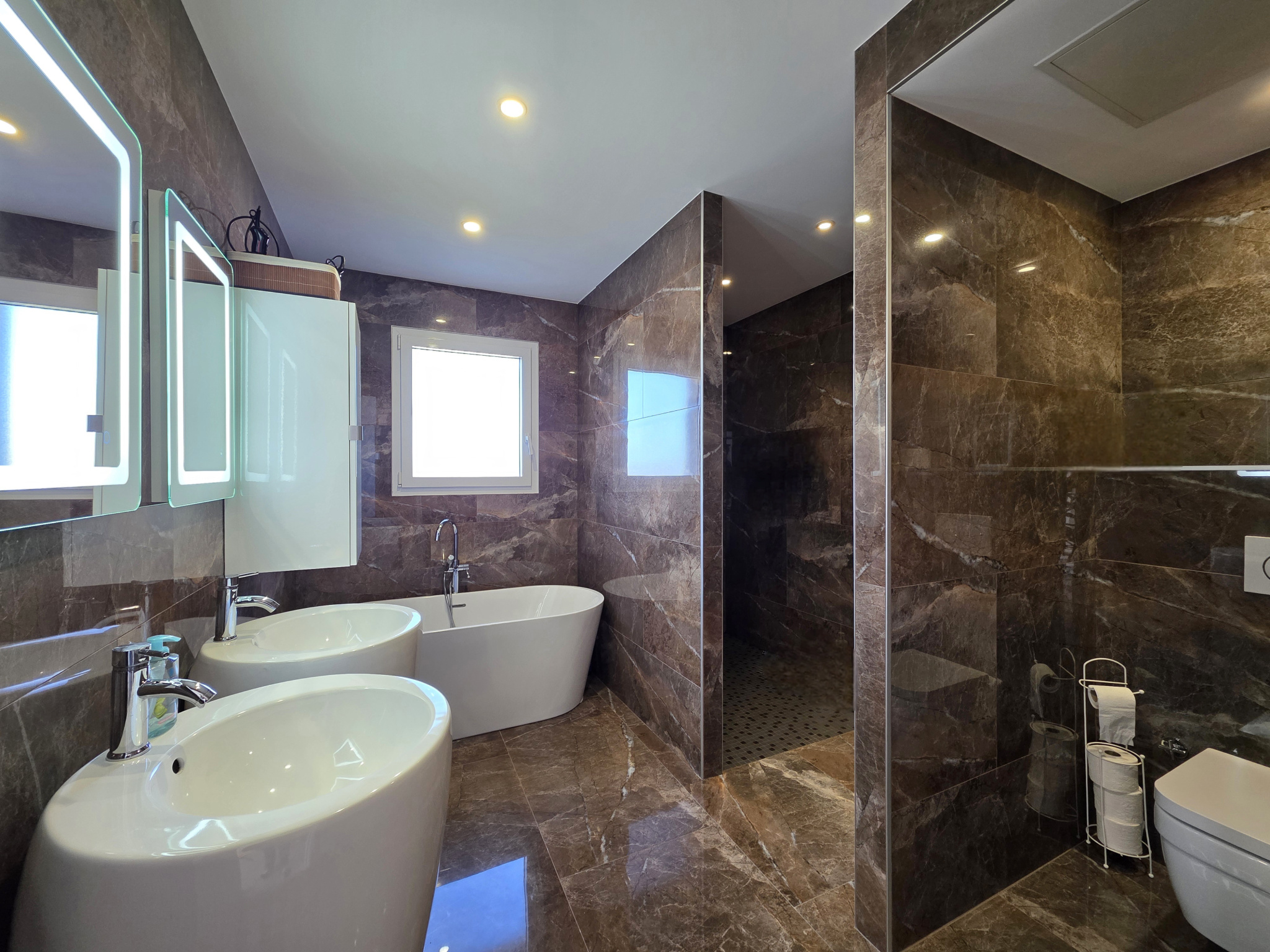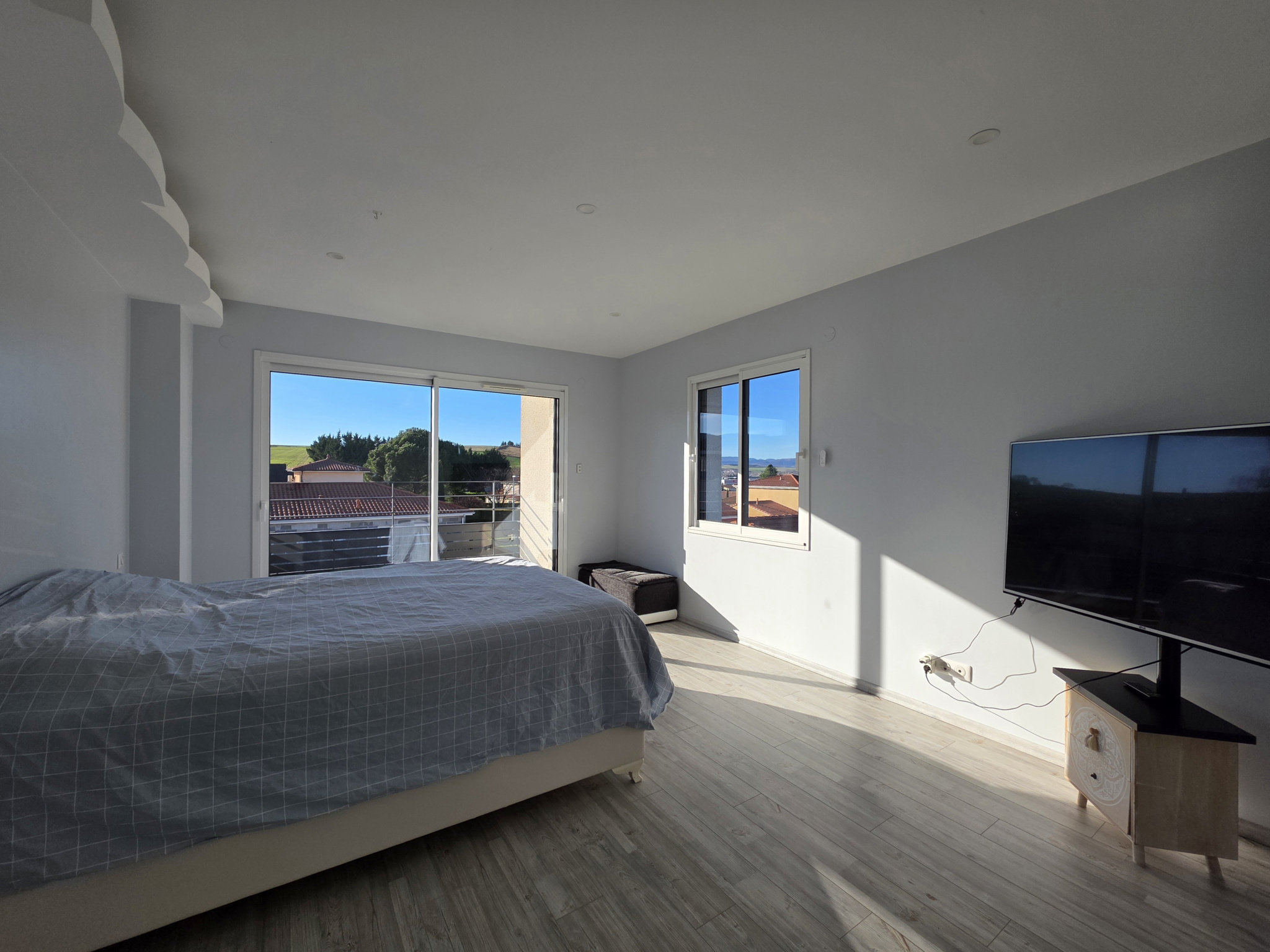 À l'étage un grand palier dessert trois autres chambres de 14m2, 17.6m2 et 9.8m2, toutes avec placard, ainsi qu'une suite parentale de 28m2 avec douche, dressing et son propre balcon. Une salle de bains avec douche, baignoire et WC complète ce niveau.