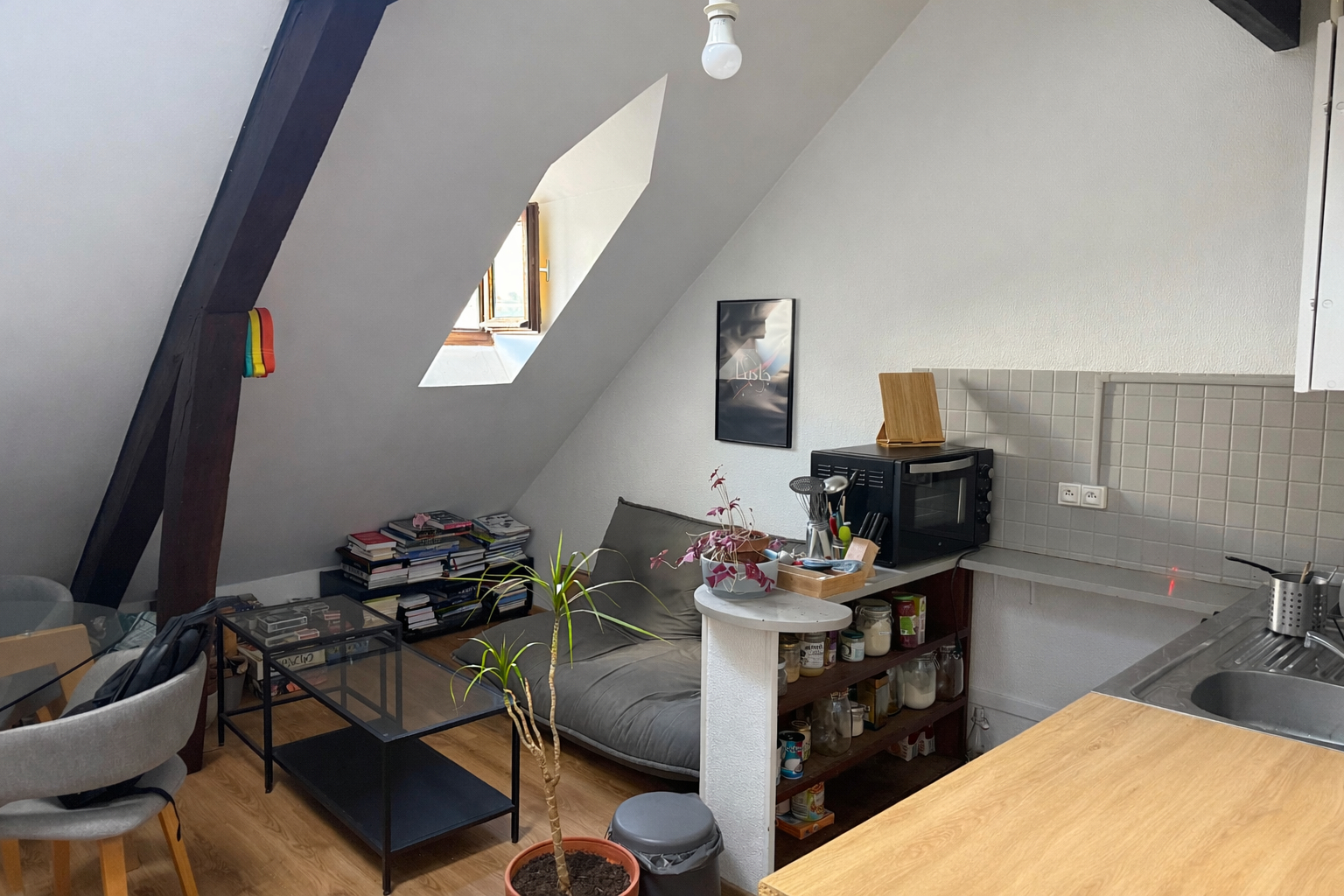 Dès l'entrée, vous serez séduit par son cachet et sa luminosité. La pièce de vie, baignée de lumière, crée une atmosphère cosy et accueillante. La kitchenette, discrètement intégrée, permet un aménagement fonctionnel.