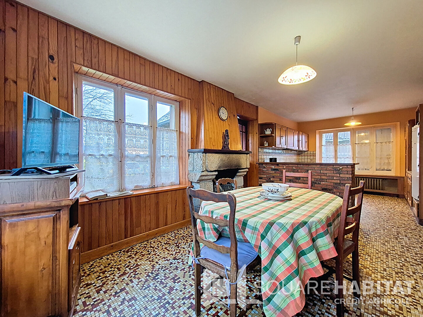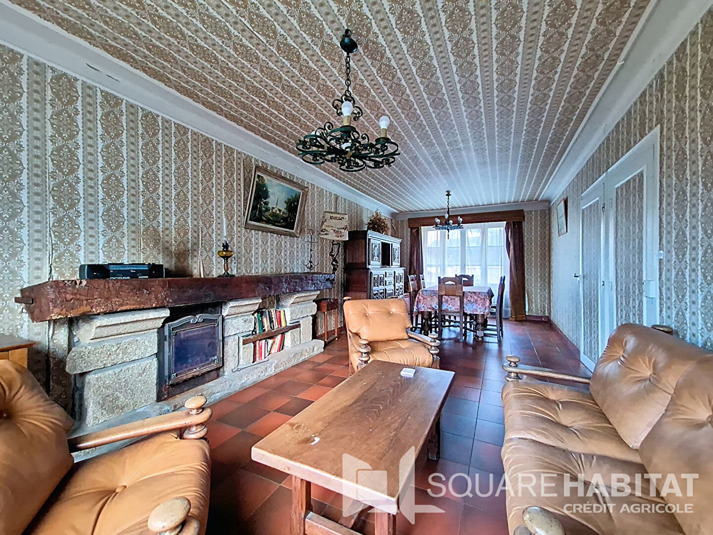 - Au rez-de-chaussée : hall d'entrée, double séjour traversant avec cheminée, grande cuisine avec salle à manger et cheminée.