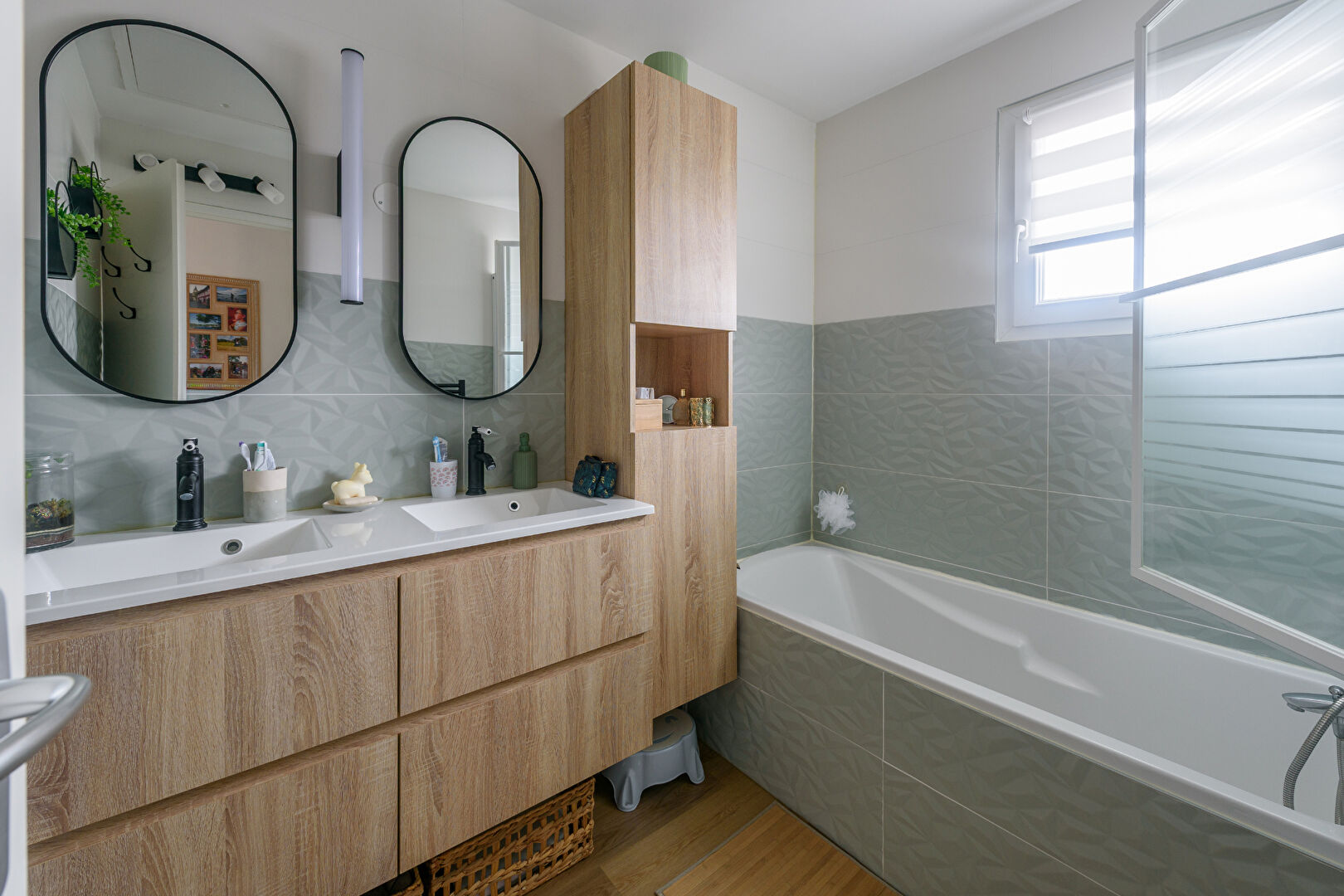 Elle se compose d'une entrée pratique avec rangement et un wc. Une vaste pièce de vie sans vis-à-vis comprend un séjour-salle-à-manger ouvrant sur le jardin et sa grande terrasse (store électrique) et une cuisine semi-ouverte bien équipée et aménagée avec soin. Le rez-de-chaussée comprend également un accès pratique au garage.
