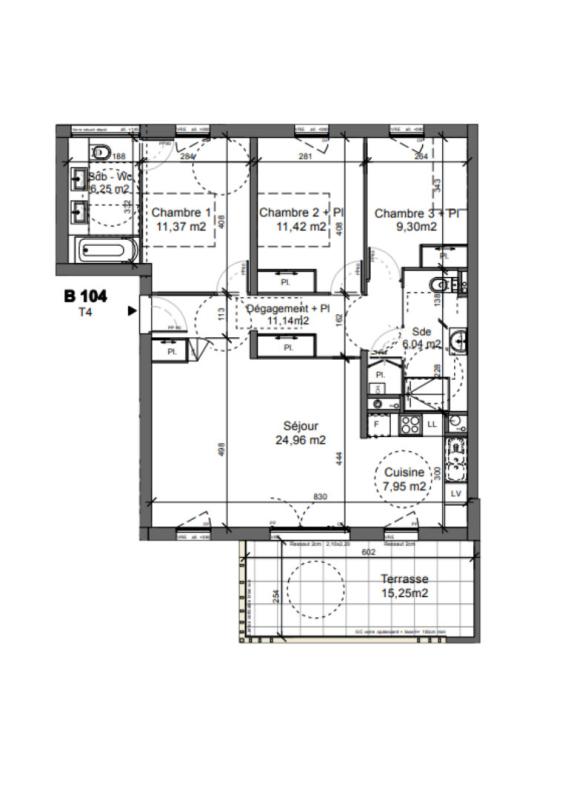 Séjour cuisine de quasi 33 m² donnant sur une terrasse de 15 m² , 1 première chambre de 11.342m², 1 deuxième de 9.30m², 1 suite parentale de 18m² avec salle de bain-wc,1 salle d'eau supplémentaire et 1 wc indépendant.