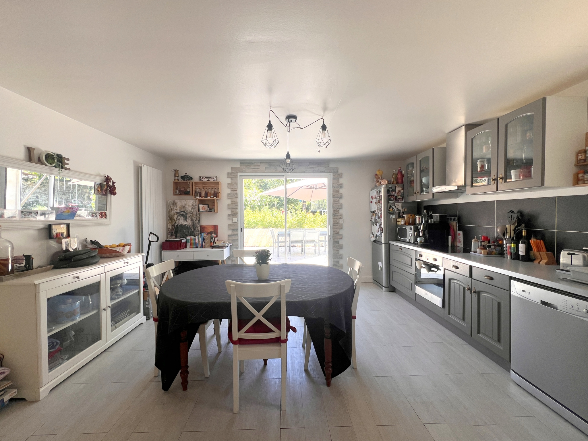 Au rez-de-chaussée, vous trouverez une entrée, un salon convivial avec cheminée insert, ouvert sur une grande cuisine équipée et aménagée, idéale pour les repas en famille. Un dégagement dessert une buanderie, un WC indépendant ainsi qu'une salle de bains.