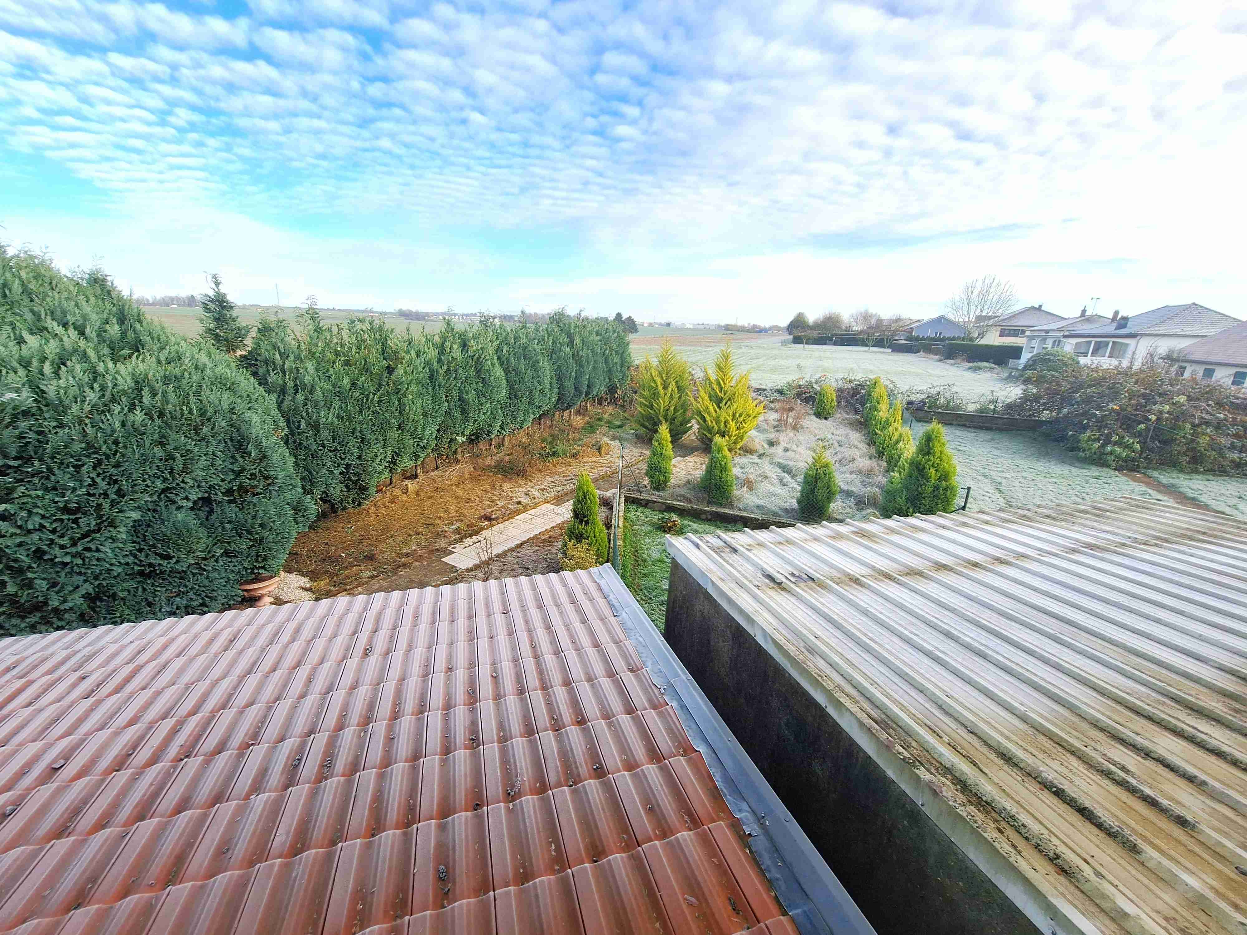 Au rez-de-chaussée, vous découvrirez un hall d'entrée desservant deux chambres à coucher (+/- 12m² chacune), un garage de plus de 40m² avec porte motorisée, ainsi qu'une pièce annexe/remise de +/- 22m² donnant un accès direct à l'arrière de la propriété ;