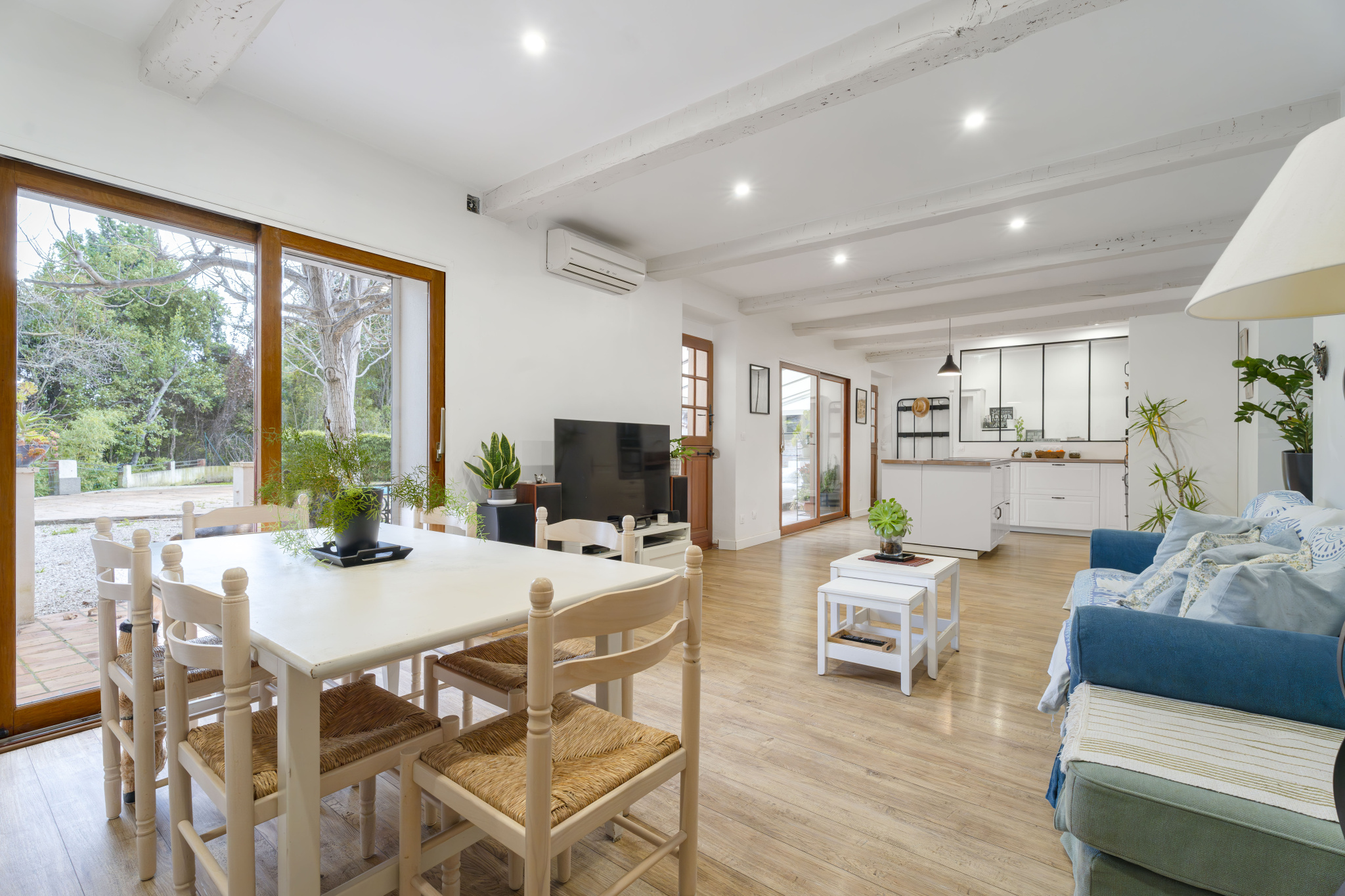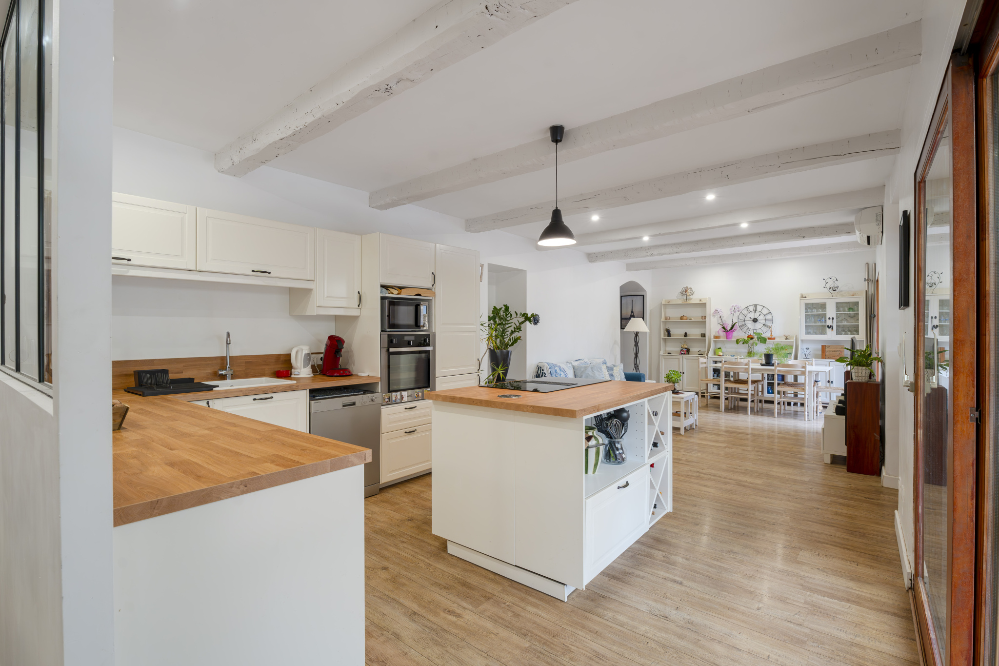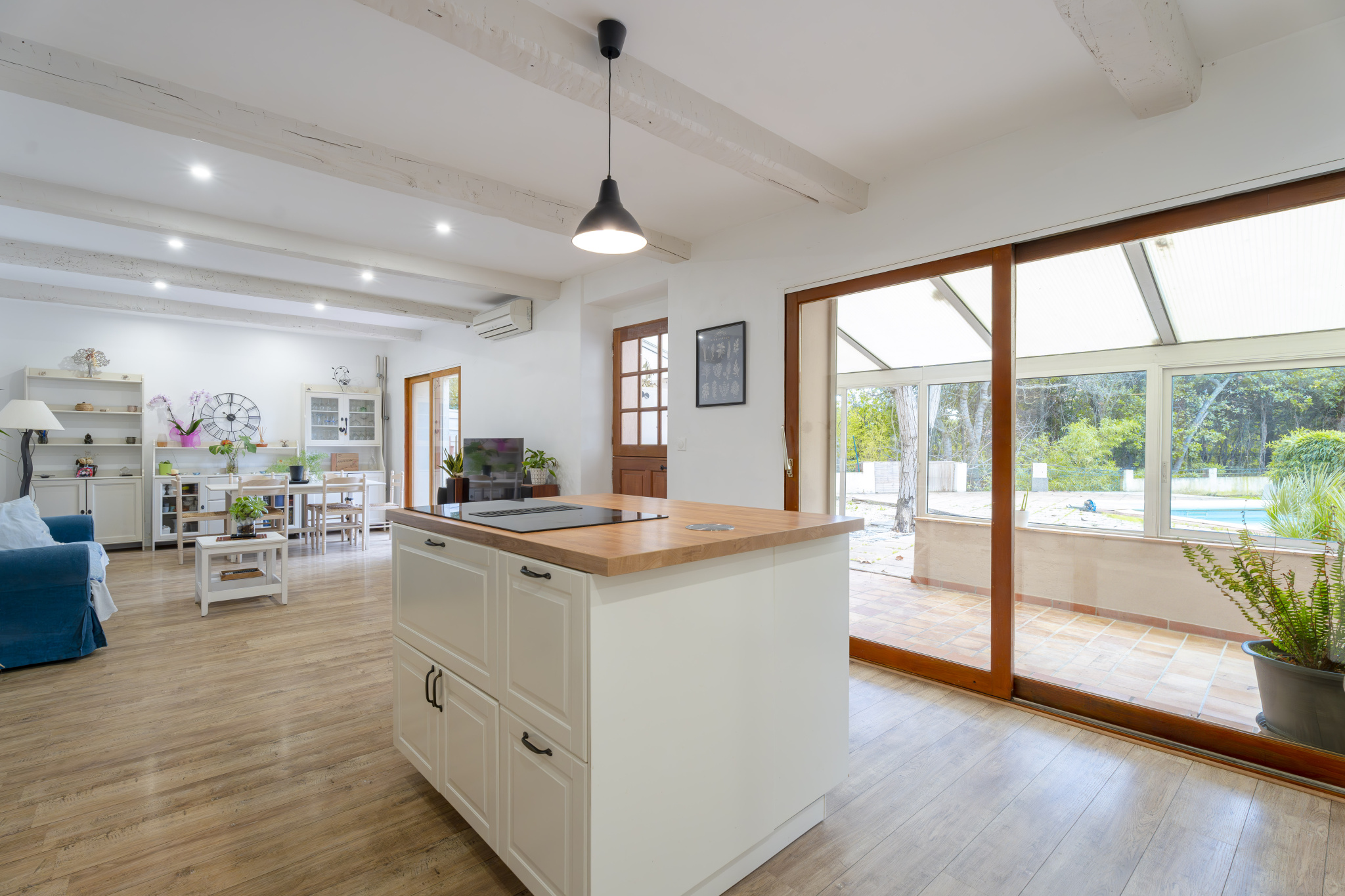 Au rez-de-chaussée d'une pièce de vie climatisée d'environ 44 m2 comprenant un séjour donnant sur une terrasse, une salle à manger avec cuisine ouverte entièrement équipée, d'une véranda d'environ 16 m2, d'une vaste salle d'eau, d'un wc indépendant et d'une très grande cave.