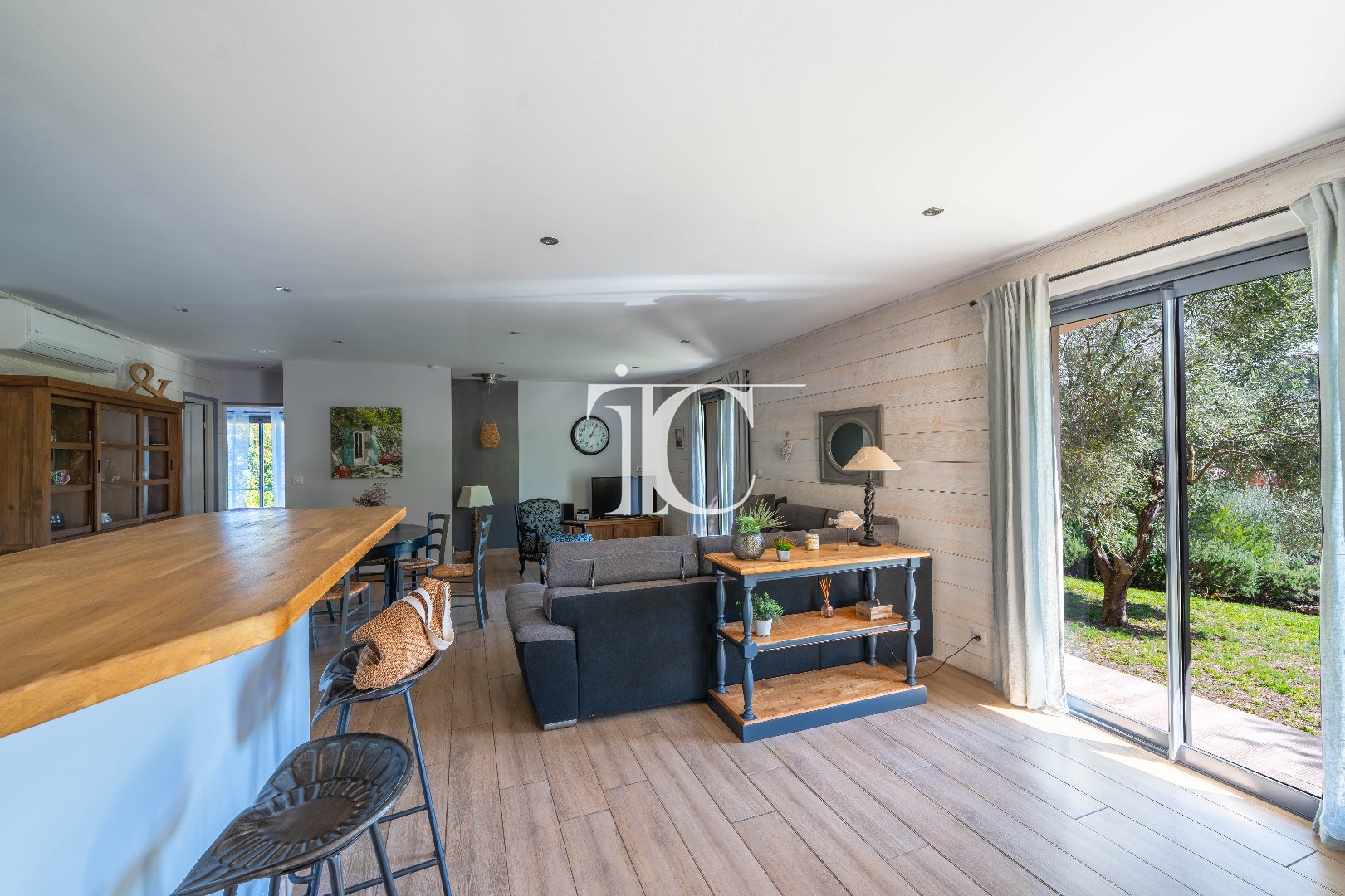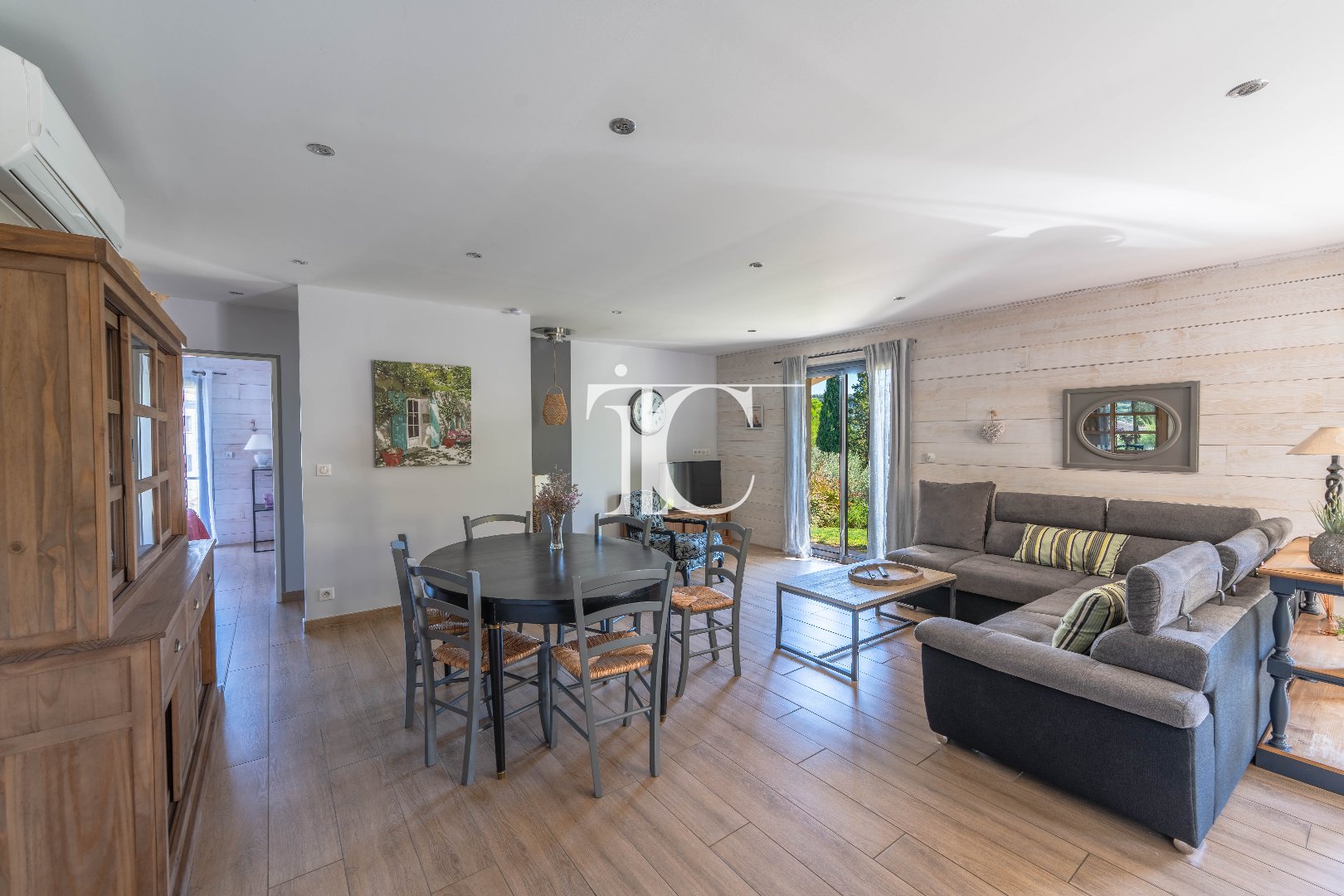 La maison dispose également d'un garage, d'un cellier et d'un abri voiture, offrant un vrai complément de surface. Le chauffage combine climatisation réversible, poêle à bois et chauffage électrique au sol, pour une ambiance chaleureuse et confortable en toute saison.
