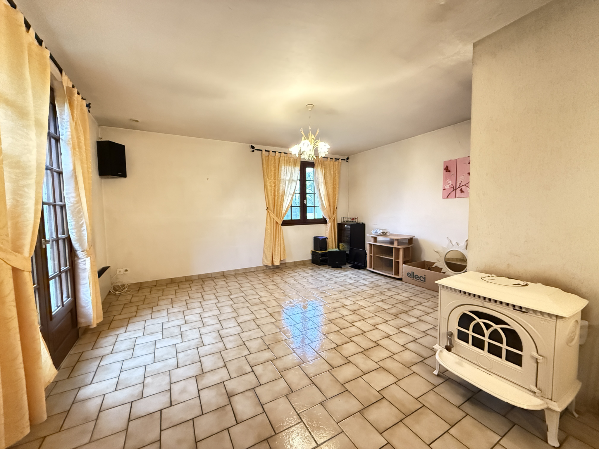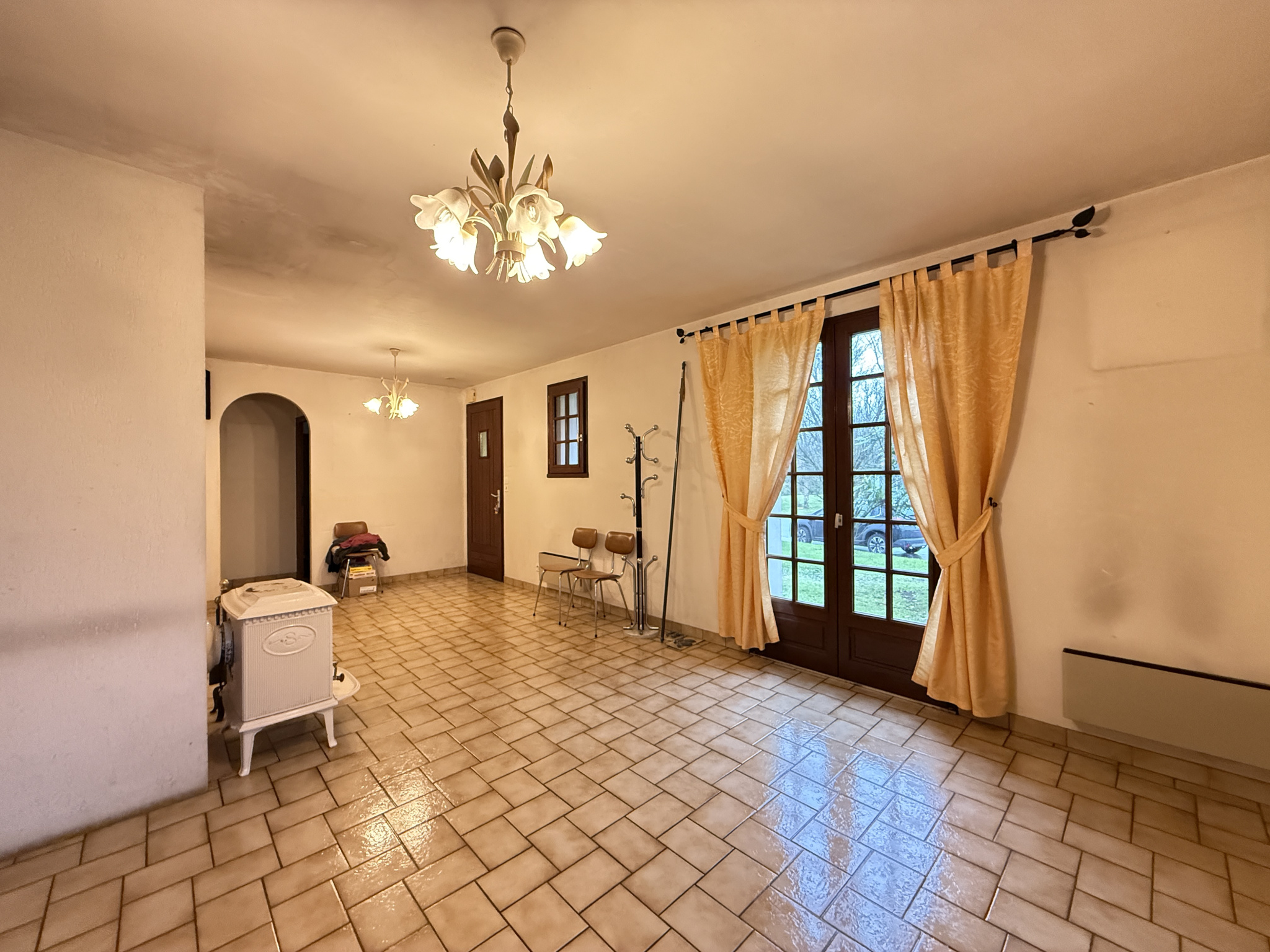 Salon/séjour avec poêle, cuisine, lingerie, dégagement 3 chambres, salle de bain, WC, garage avec grenier