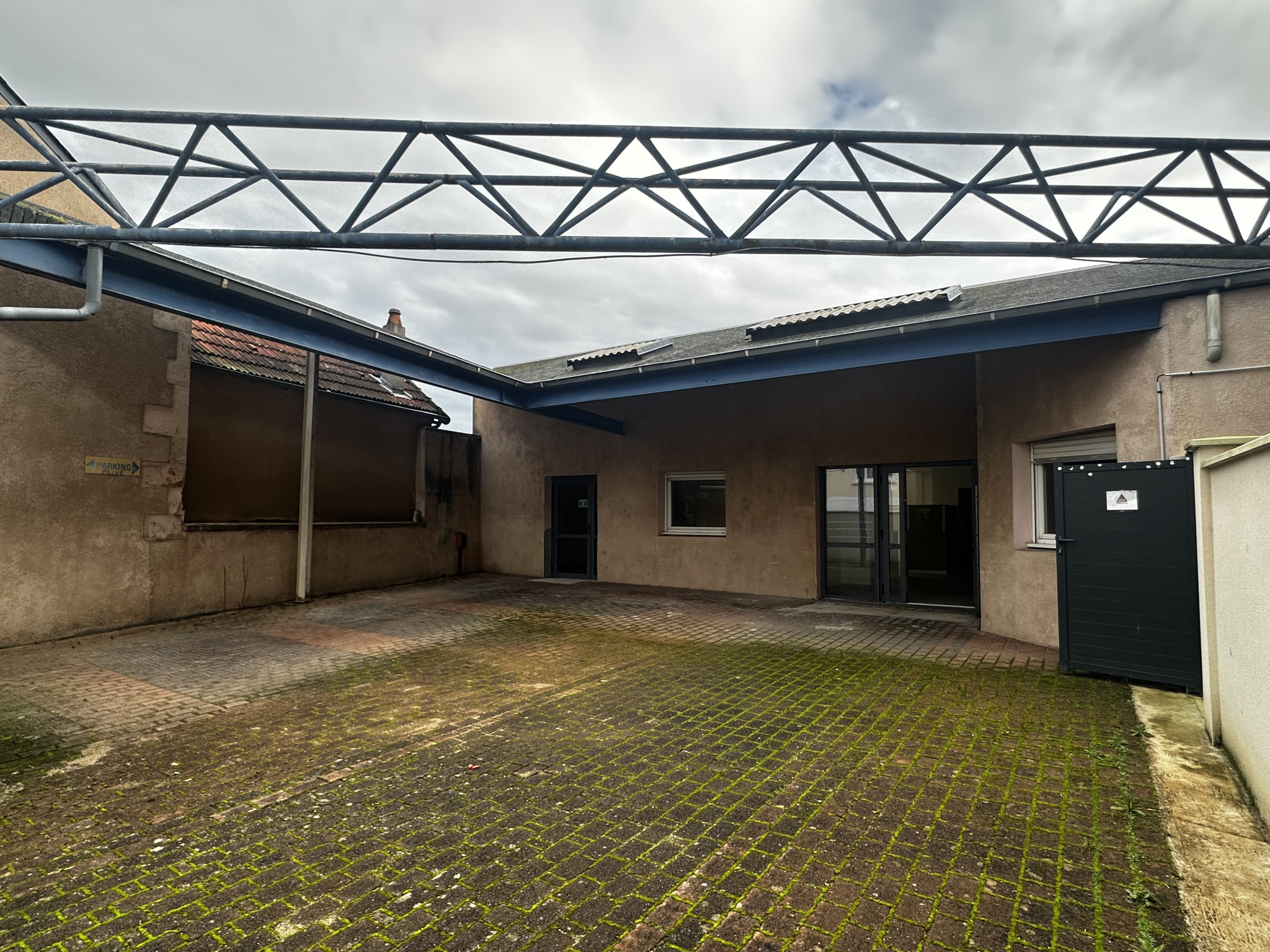 A l'extérieur, une grande cour à l'avant du bâtiment permet soit une cour d'activité soit un espace de stationnement pouvant accueillir plusieurs véhicules. L'accès est sécurisé grâce à portail motorisé, fermé et sécurisé.