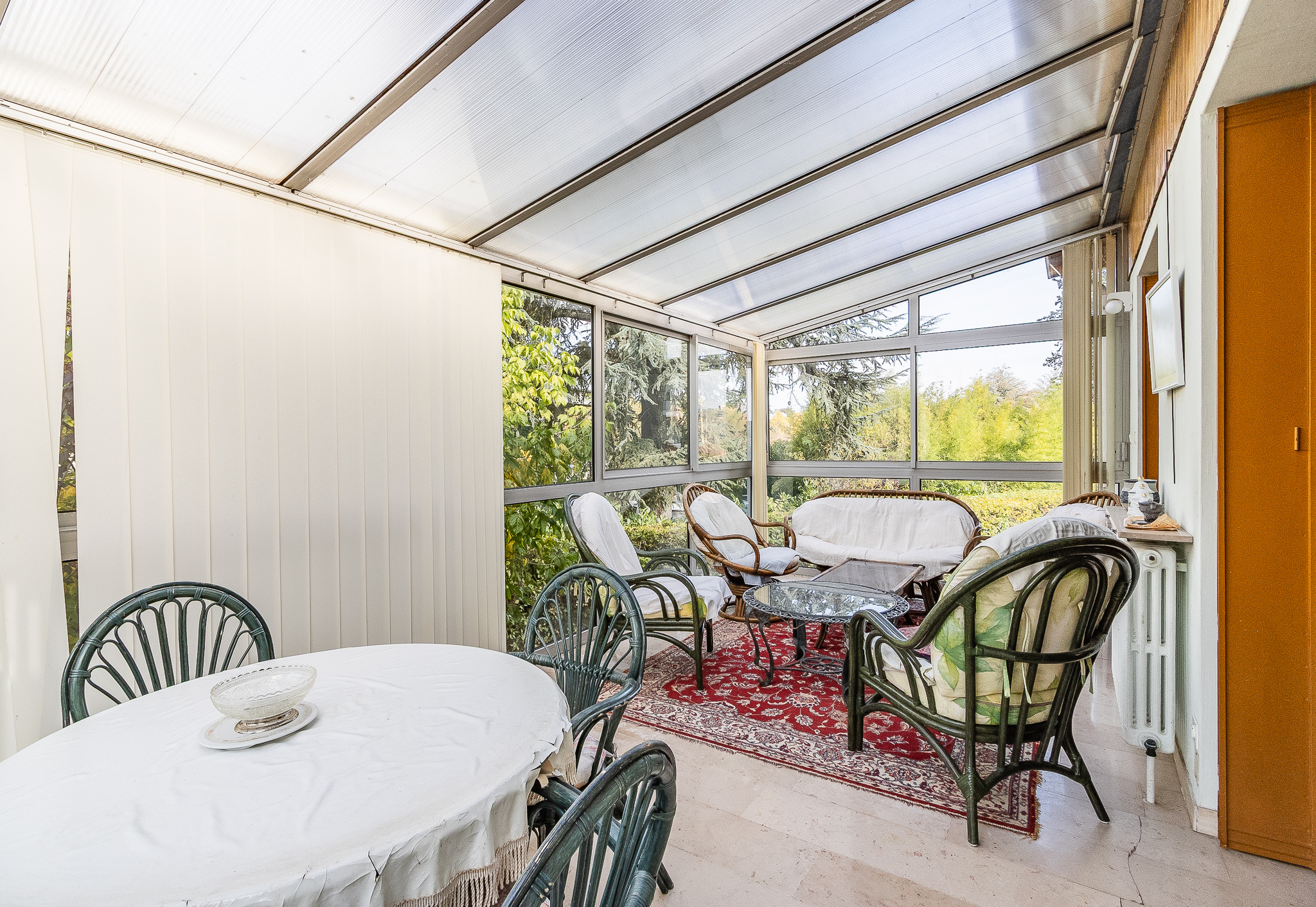 Le jardin, soigneusement entretenu, s'étend sur 1287 m2 de verdure arborée où chaque saison apporte sa touche de couleur. Une grande terrasse invite aux repas d'été, protégée par un store banne, tandis qu'une véranda baignée de lumière prolonge les beaux jours à l'intérieur. Un vaste garage de 44 m2 et plusieurs dépendances complètent l'ensemble, offrant de multiples usages selon les besoins et les envies.