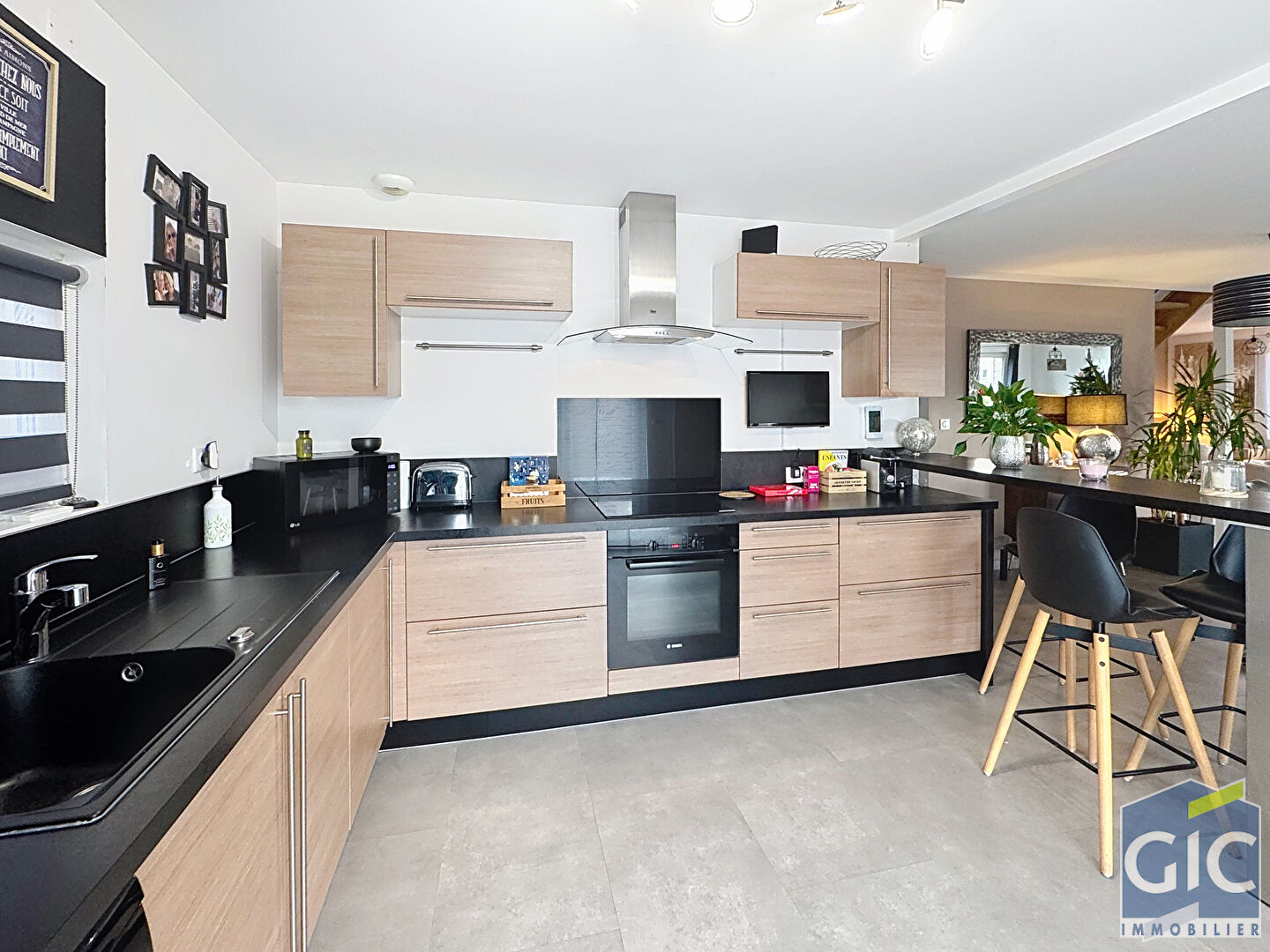 La pièce de vie, lumineuse et ouverte, s'accompagne d'une cuisine moderne, idéale pour recevoir.
