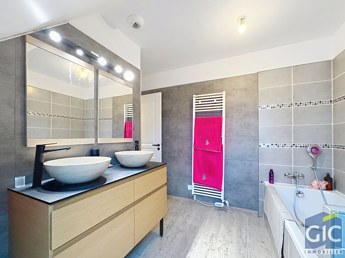 Garage, stationnements privatifs et jardin soigné complètent ce bien aux prestations harmonieuses