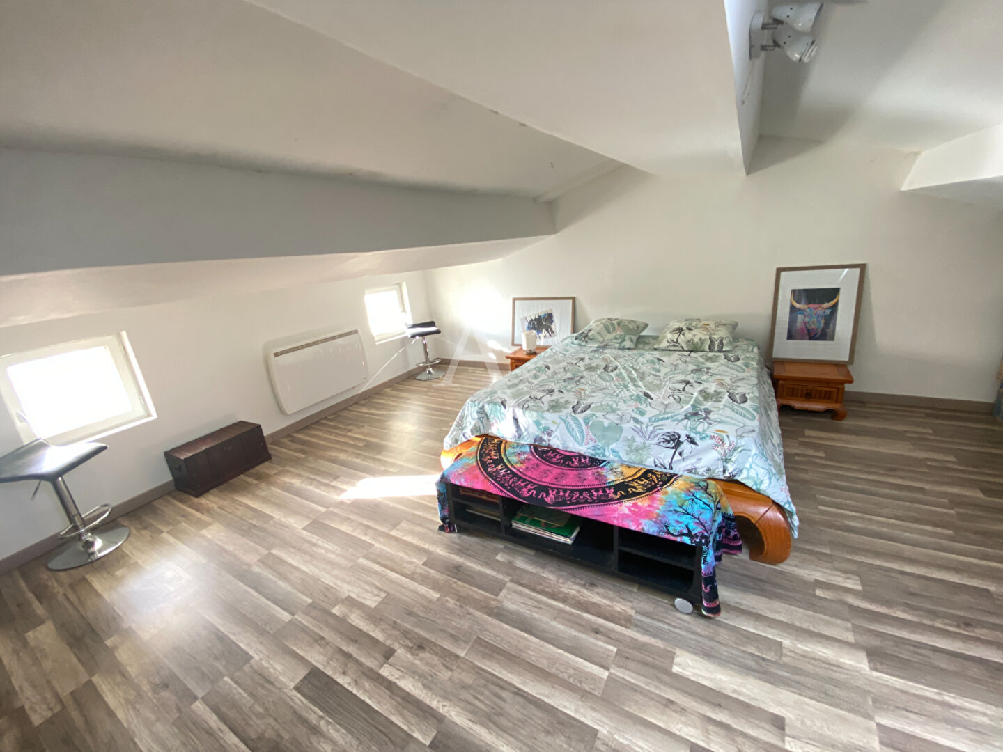 À l'étage, l'espace nuit se compose de deux chambres, d'un bureau (idéal télétravail ou chambre d'appoint) et de combles aménagés en pièce de jeux, offrant un espace supplémentaire très apprécié.