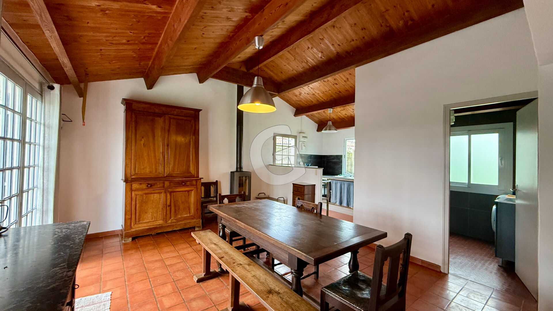 Elle se compose d'un salon-séjour lumineux équipé d'un poêle à bois, ouvert sur une cuisine, deux chambres, ainsi qu'une salle d'eau avec WC.